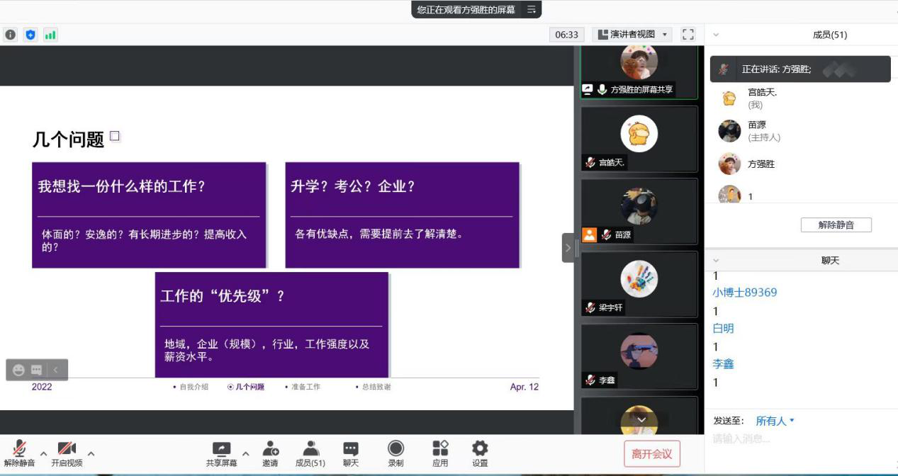 随后,分享会进入自由提问环节,线上的同学们咨询了关于择业、简历制作方面的问题以及疑惑,参与分享的同学一一做出详尽回答。活动的最后,主持人对同学们的积极参与表示感谢,并预祝同学们都能找到称心如意的工作。
