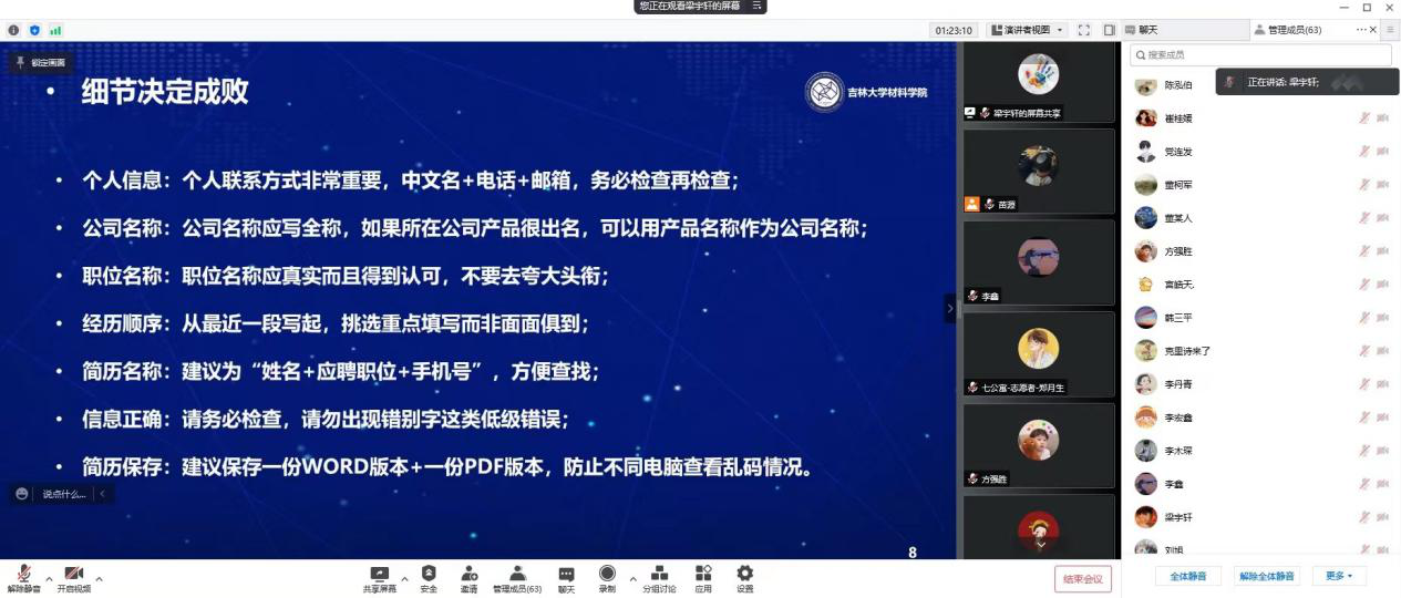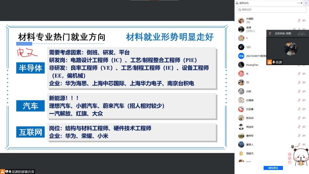 分享会开始,主持人介绍了分享会流程,全会由“经验分享”和“自由提问”两个环节组成。首先,已签约华为海思的方强胜主要针对岗位选择、面试准备等方面结合自己的经验进行了分享。他强调岗位的选择要参考国家政策,并建议大家通过每年BOSS研究院发布的应届生就业趋势报告了解行业的岗位需求。签约荣耀的苗源为大家详细介绍了材料专业的就业方向与专业面试经验,他表示由于芯片与新能源行业的崛起,材料专业的就业形势明显走好,同学们可以选择的岗位明显增多;针对专业面试,他建议同学们提前准备详细的课题介绍,并且在面试过程中一定要展现出自己的自信心。签约一汽大众的宫皓天侧重讲解了长春本地的职业选择与岗位要求,比如一汽解放、红旗、大众的区别等等。成功应聘深信服的梁宇轩则针对如何做好简历、如何回答主管面试中的常见问题进行了详细的报告。