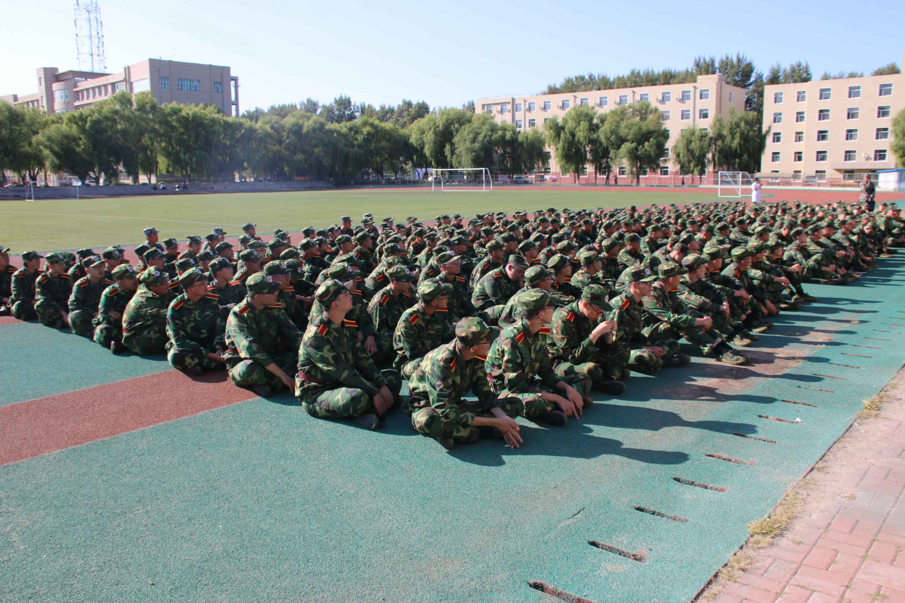 为了更好地保持新生的身心健康,使军训训练松弛有度,加强新生爱国意识,材料学子于训练的空闲时间在田径场学习唱军歌。