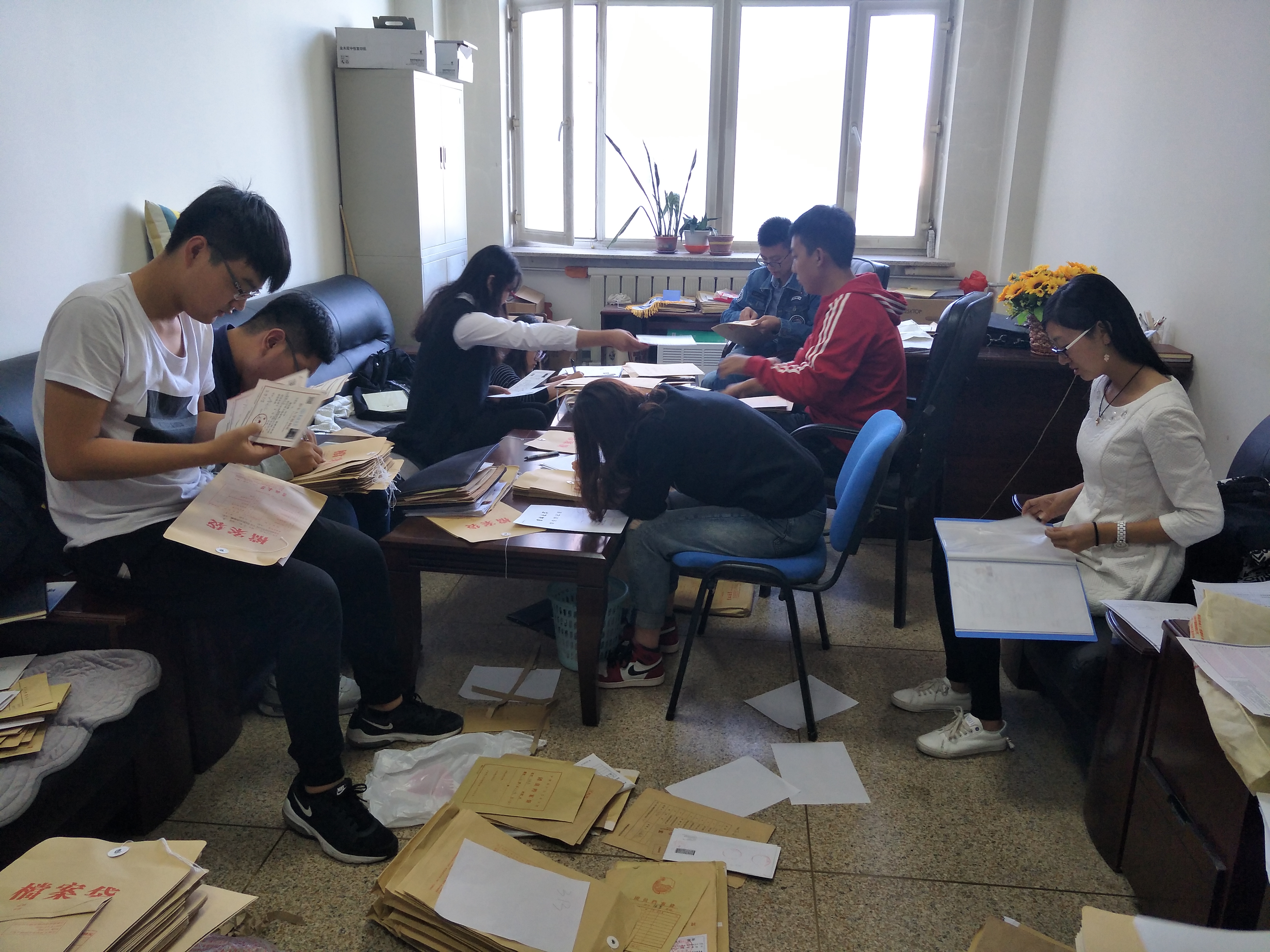 2017级辅导员杨超老师亲自为大家讲述了整理新生档案应注意的事项。其中包括:如何填写档案袋封面、如何检查新生资料是否齐全以及该把哪些资料放进档案袋。并要求各班主任助理把缺少部分资料或资料信息有问题的同学记录下来。杨超老师说完注意事项后,各班主任助理便迅速地投入到新生档案的整理中,负责每个班的两位班主任助理分工明确,其中一人负责新档案袋封面的填写,另一个负责检查新生资料并装进档案袋,以确保每一位同学的资料信息都是准确的、齐全的。在辅导员杨超老师严谨负责地带领下,在各班班主任助理认真积极地工作下,下午4:00,新生档案的整理工作顺利完成。
