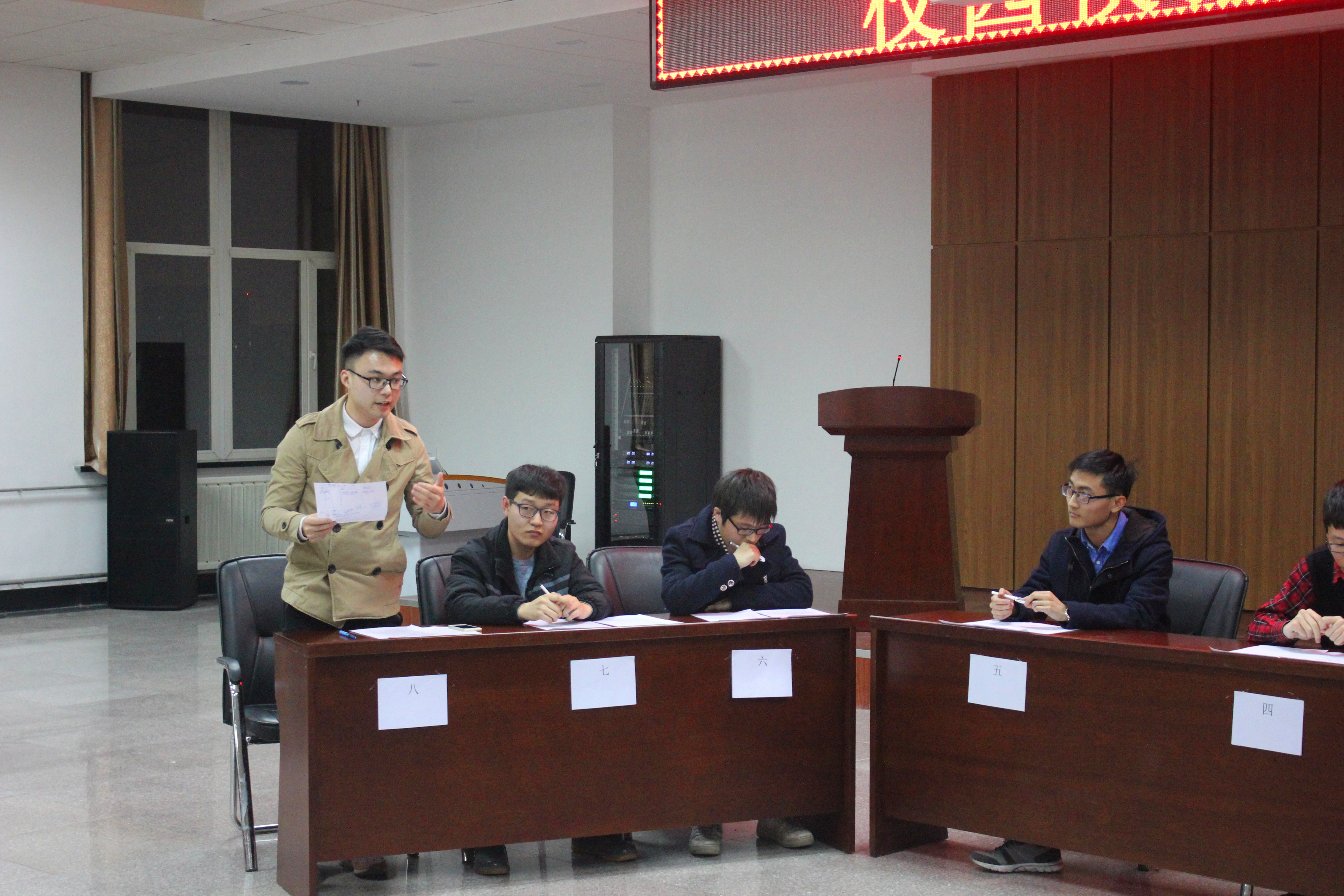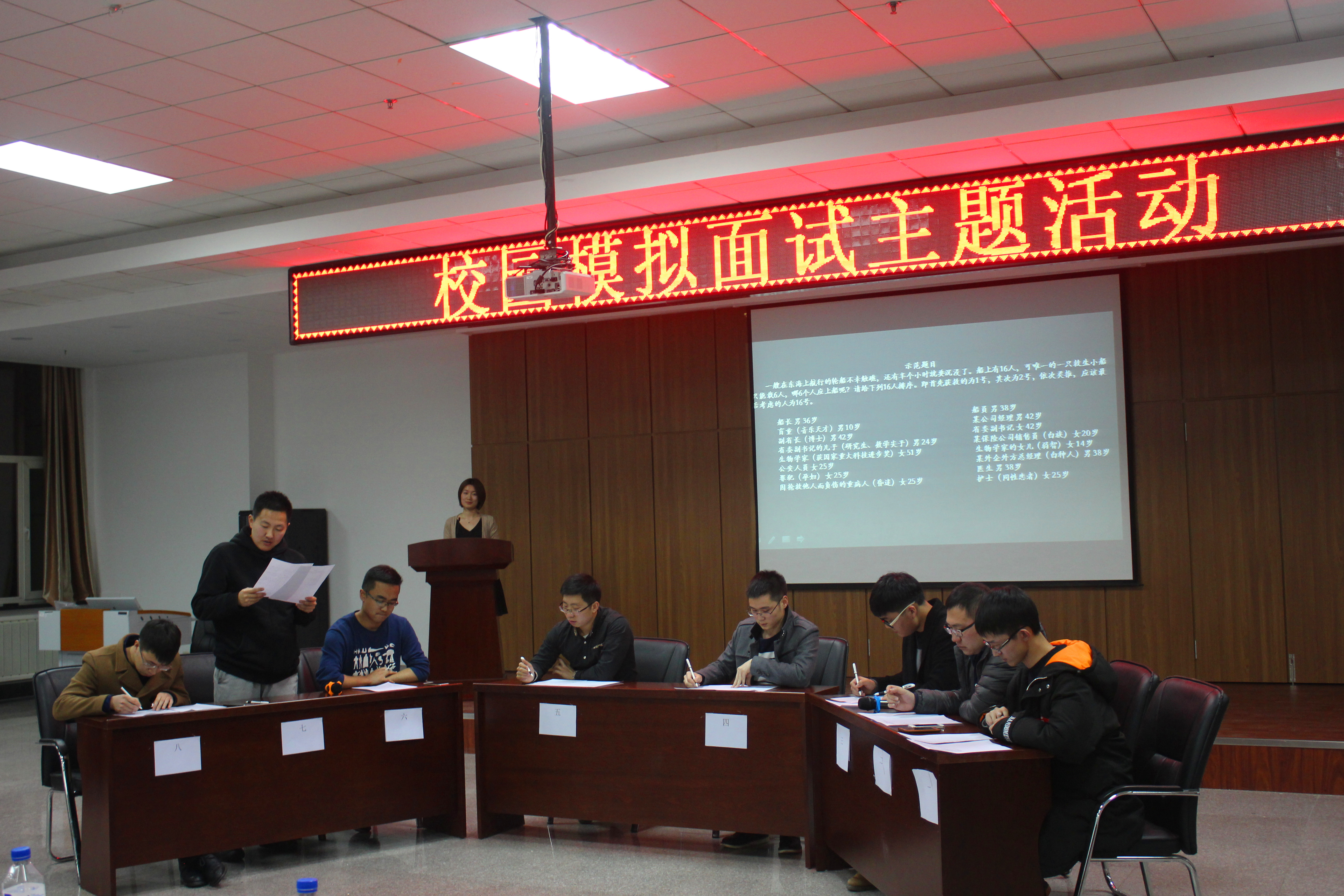 此次活动邀请了8位已签约工作的优秀师兄到场。首先,分别签约一汽大众和上海大众的马骁和陈俊师兄先后上台分享了自己的求职经验。两位师兄内容丰富的ppt和耐心的讲解使同学们受益良多。但纸上得来终觉浅,随后8位师兄一起为大家进行无领导小组讨论示范。台上师兄们的讨论你来我往,激烈争讨,而台下的同学们也早已跃跃欲试。师兄讨论结束后,由16位同学分为两组也分别进行无领导小组讨论。和师兄们的表现相比,同学们还略显稚嫩,讨论中出现不少问题。但随后经过师兄们的点评,很多同学对无领导小组讨论有了更深入的了解。