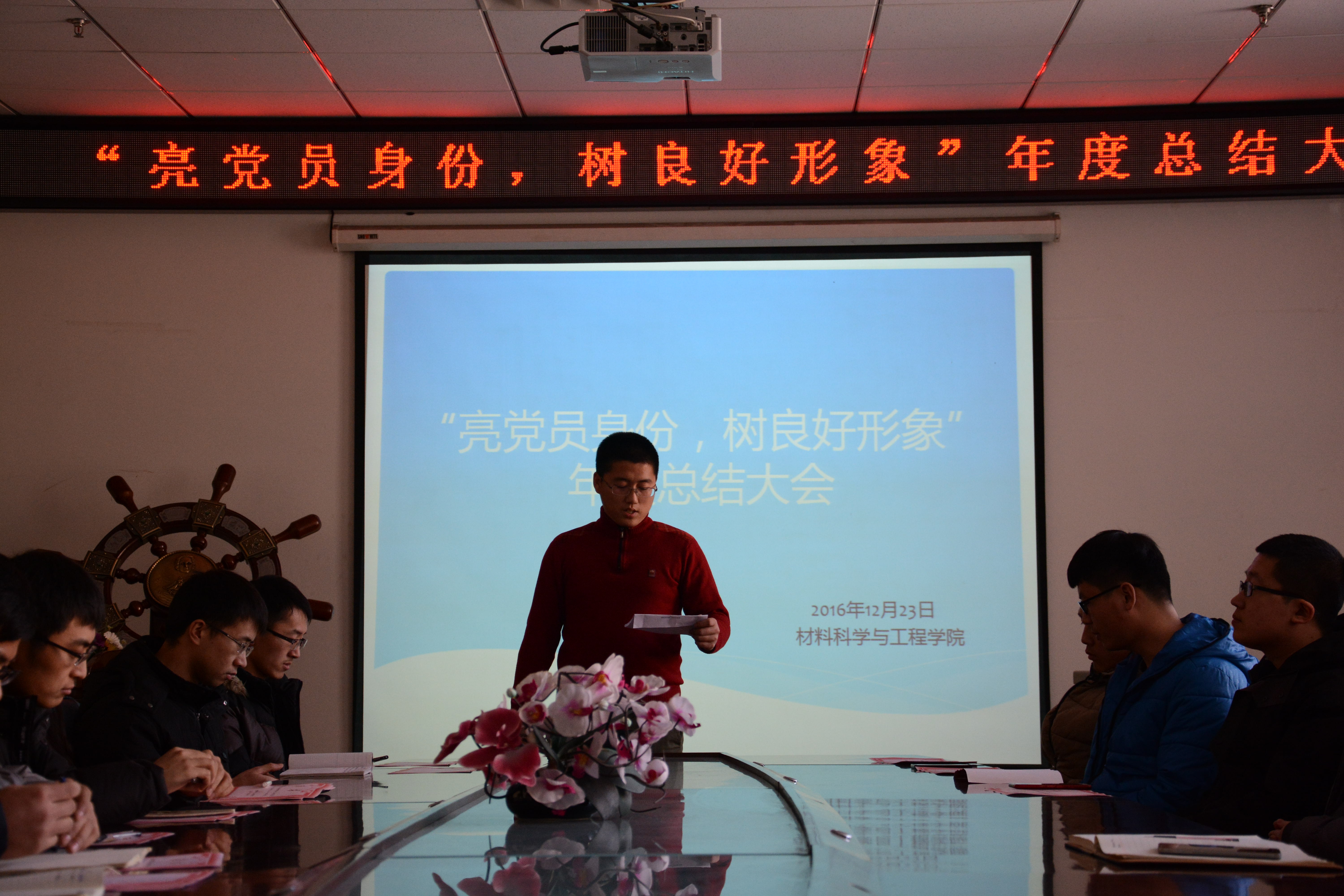 为了解研究生工作室的现状,增强学生的安全观念,实现防患于未然,黑料正能量 于2016年12月23日下午,在材料黑料正能量 党委的指示下组织召开了“亮党员身份,树良好形象”年度总结大会,院党委书记周岩松,院党委副书记于雅琳,院研究生秘书刘徽老师及材料黑料正能量 各个工作室学生负责人参加了此次会议。