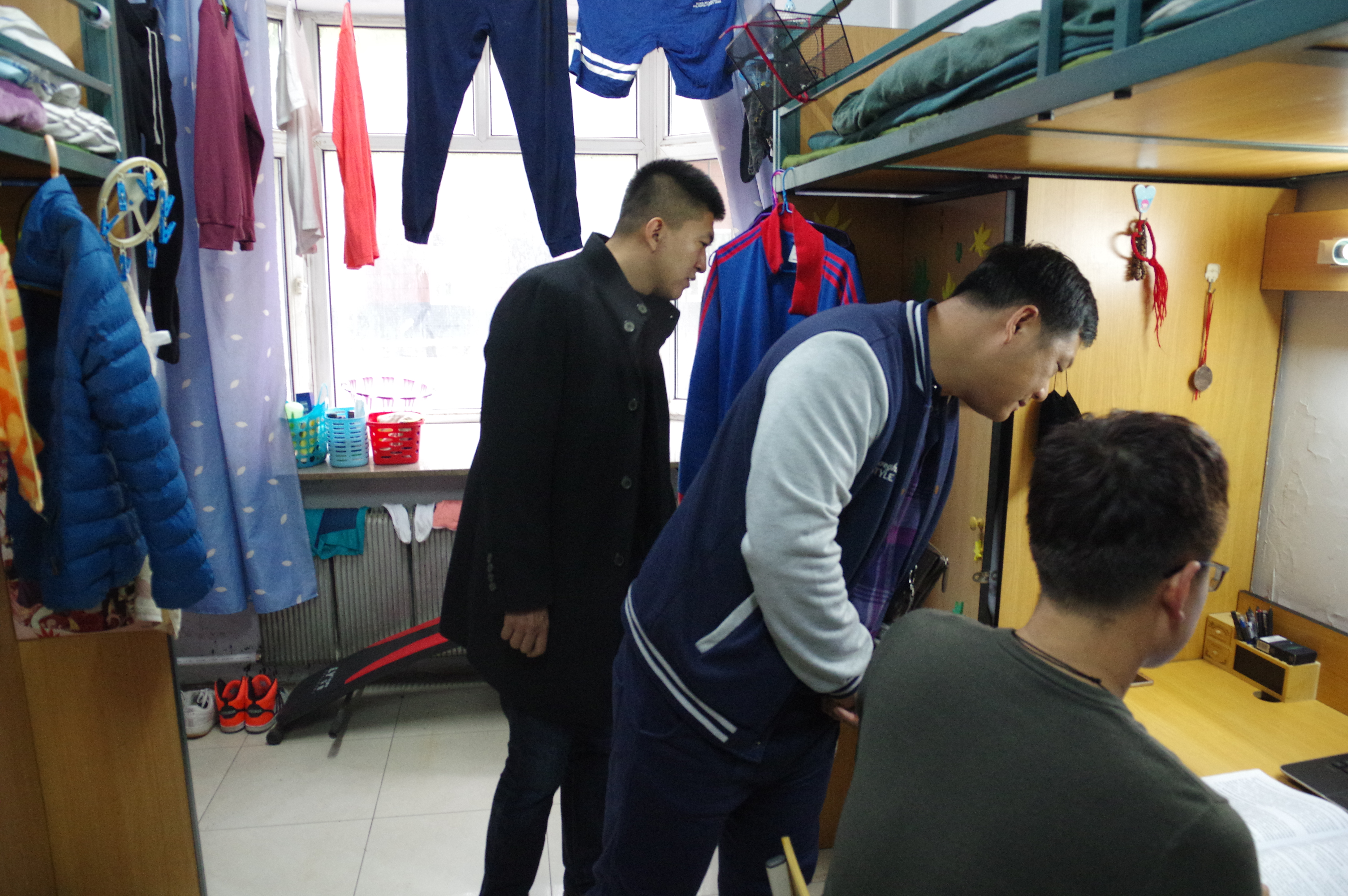 活动在十一公寓展开,李书记和老师们首先走访了2013级学生的寝室,并和他们亲切交谈,在访问过程中发现,学生精神状态很好,学习与寻找工作进展顺利,寝室卫生普遍情况较好,个别寝室存在卫生不合格现象,张老师对这些寝室的学生进行了督促。随后对学生二公寓进行了走访,因2014级学生寝室较小,物品较多,摆放存在问题,但学生寝室依然干净卫生。在对十三公寓2015级学生寝室的访问中,李书记和佟老师均表示满意,学生在行为表现、寝室卫生及物品摆放上普遍表现良好。在此次检查中2016级学生表现最为突出,同学们文明礼貌,寝室干净整洁,装饰丰富多彩,将寝室装扮出家的感觉。