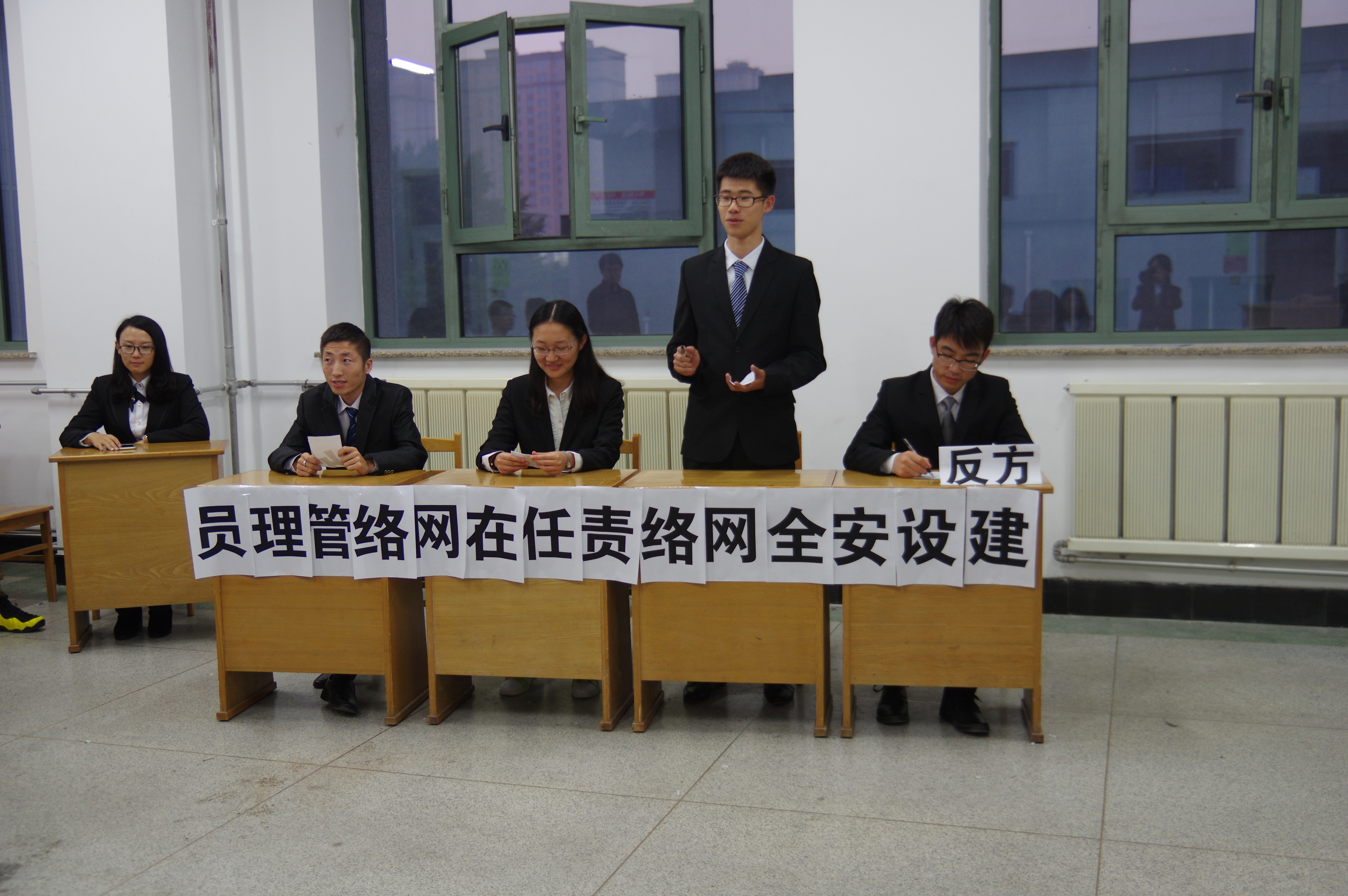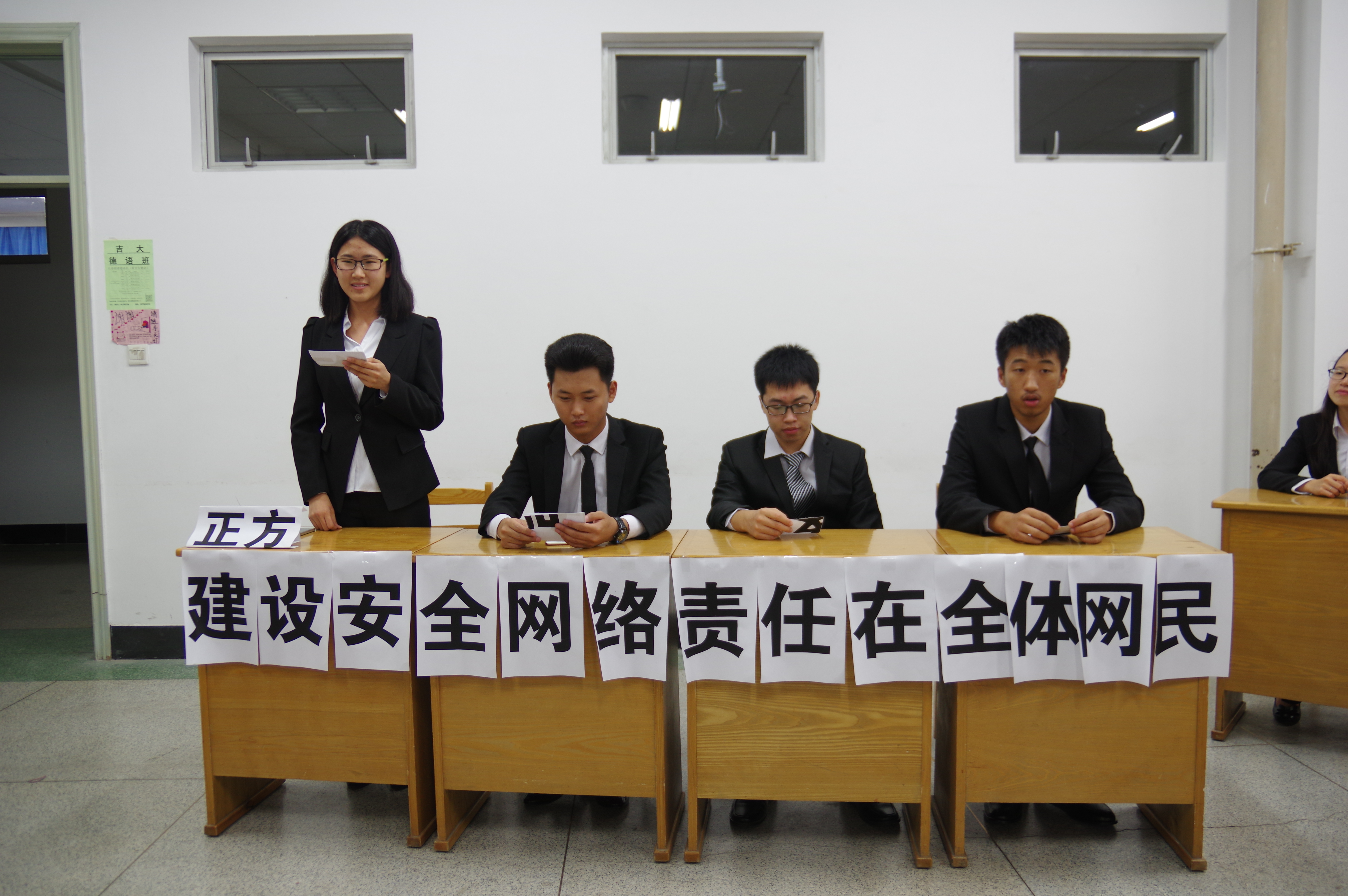 此次辩论赛的正方选手分别是宋嘉俊,马赫,徐宇欣和杨壮,辩题是建设安全网络责任在全体网民;反方辩手分别是陈恒,王冉宾,孟哲和孙少杰,辩题是建设安全网络责任在网络管理人员。双方辩手在比赛尚未开始就已摩拳擦掌,成竹在胸,热情的观众们已经开始呐喊助威,一时之间现场气氛十分活跃。