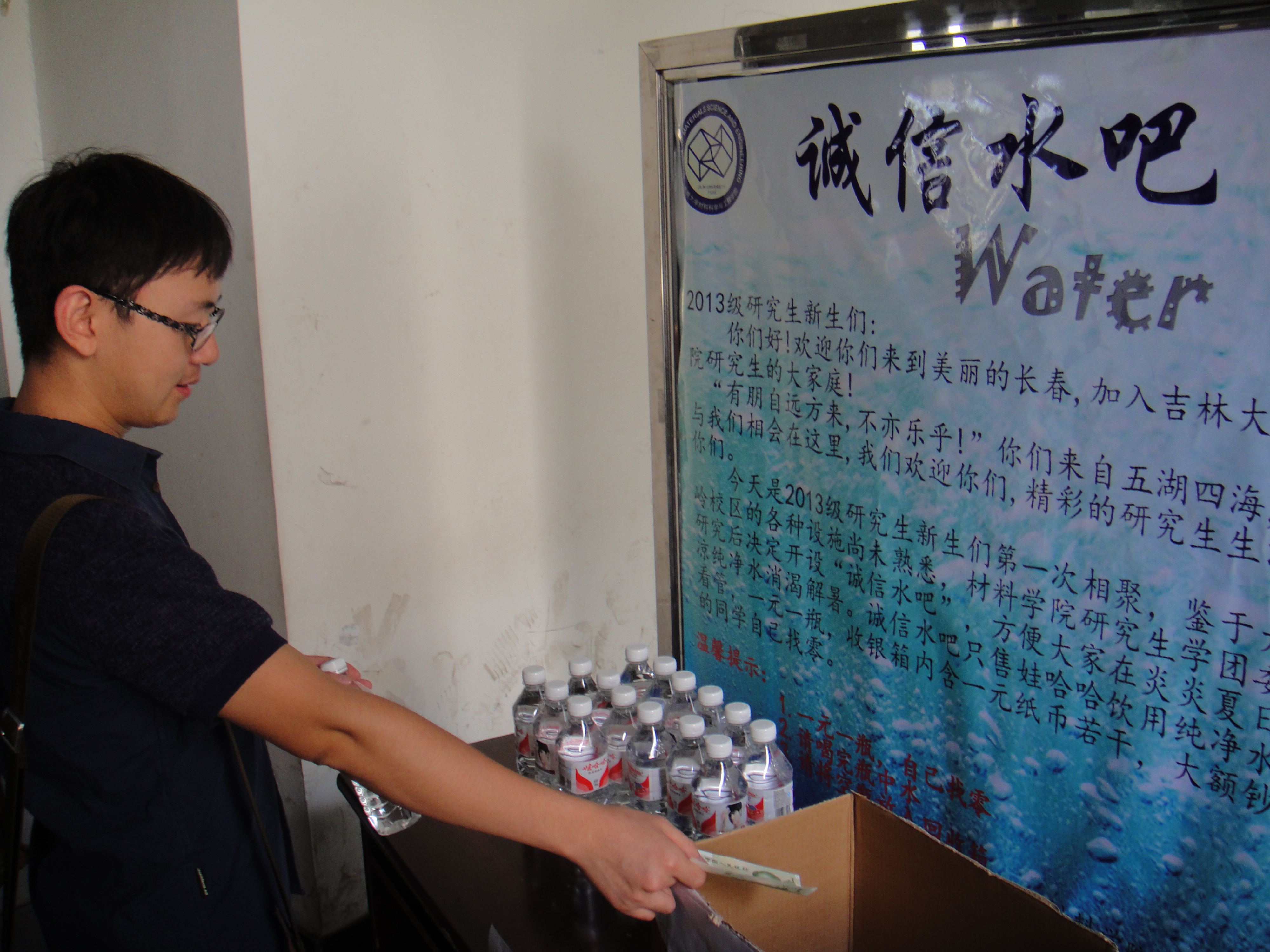 在本次会议进行之前,研究生学团委特意设置了诚信水吧,大家自己买水,自己找零,以这种独特的方式呼吁大家从自身做起,诚信为人,诚信一生。本次学术道德和学风建设专题教育,使大家更加深刻的体会了诚实守信的重要性,相信通过本次专题教育,大家一定能够更好的学习和科学研究,材料黑料正能量