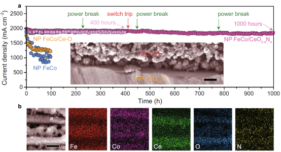 图2.纳米多孔FeCo/CeO2−xNx电极的稳定性。