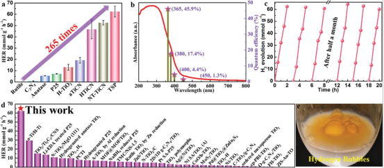 这种新结构产生的双S型转移机制,克服了传统异质结接触势垒大、晶格失配和电荷传输缓慢的局限性。该光催化剂表现出62.37 mmol g−1 h−1的优异光催化析氢速率,并且在365 nm处表现出45.9%的表观量子效率,这远远超过了大多数TiO2基半导体光催化剂。与此同时,制备的光催化剂展现出较优异的循环稳定性。
