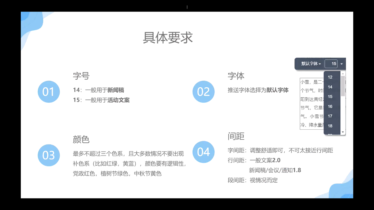 会议伊始,理事长陈诺宣讲了本次培训会的主要流程。随后,新媒体中心各部门的工作人员依次从推送排版、新闻稿撰写、摄影技巧、Ps和Pr软件应用、海报及封面制作五大方面详细展开讲解,会议期间全体培训人员耐心讲解,对与会人员提出的问题,通过具体软件操作演示和实例分析进行回答,尽显一派和谐的学习景象。