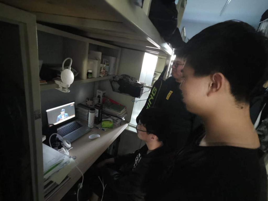 全体辅导员老师和本科、研究生毕业年级学生代表一同观看报告会,其余学生以寝室为单位分小组线上观看。