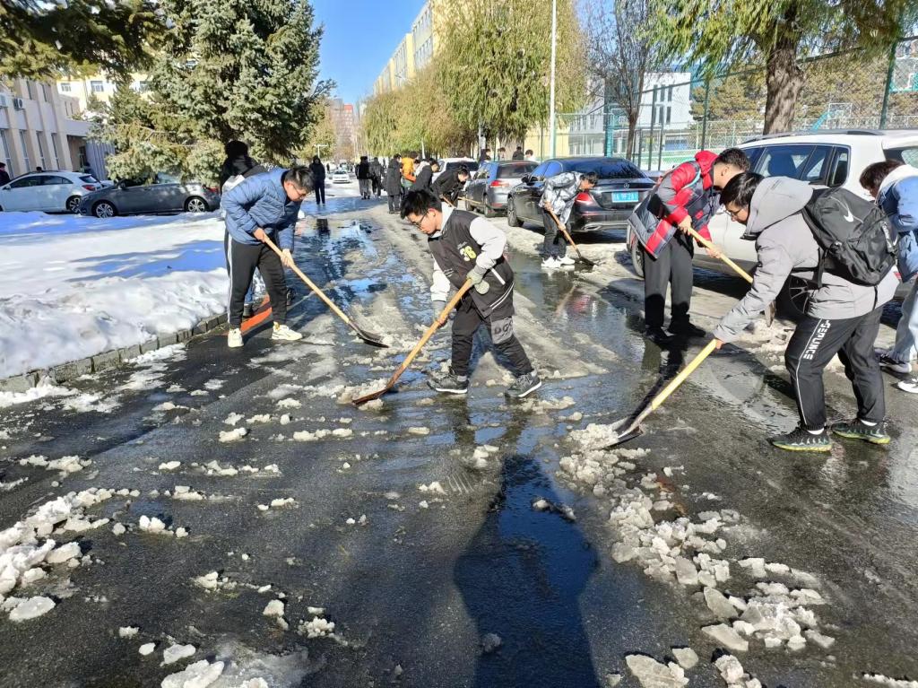11月12日中午,活动伊始,在上一次扫雪除冰劳动的基础上,严老师根据本次降雪情况,进一步优化了工具分配和区域分配,同学们根据前期分配的任务分工,领取扫雪工具。由于此次降雪伴随降温,有部分区域已被车辆和行人踩实,且反复升温降温逐渐形成结冰层,清扫难度较大,但这丝毫没有打消同学们劳动的积极性,同学们互相配合、团队协作,清雪工作有条不紊的进行。经过近两个小时的劳动,分担区内的积雪和冰层基本清扫完毕。