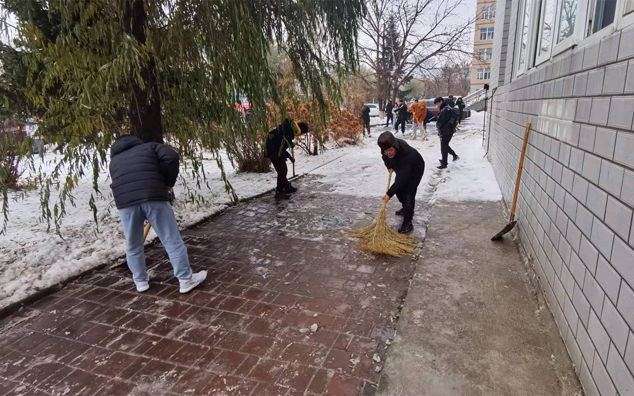 在严老师的指导和带领下,同学们纷纷拿起扫雪除冰工具,有条不紊地进行扫雪除冰劳动,在近两个小时的劳动中同学们发扬了不怕苦、不怕累的劳动精神,确保高标准、高质量、高效率完成扫雪除冰工作,清除安全隐患。