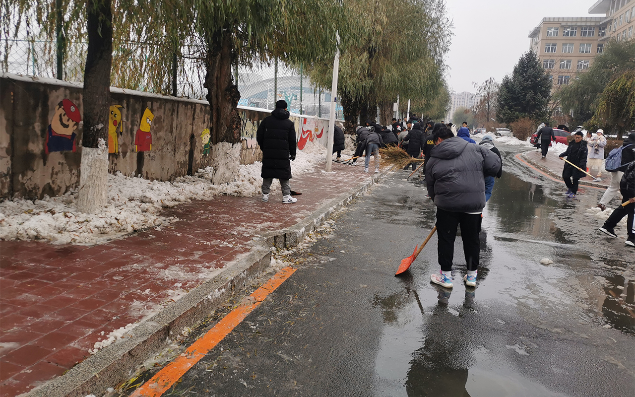 学子传真情,扫雪除冰暖寒冬”此次扫雪除冰工作,不仅使道路变得干净整洁、校内师生的出行更加安全便利,更是对学生开展劳动教育的有效途径。