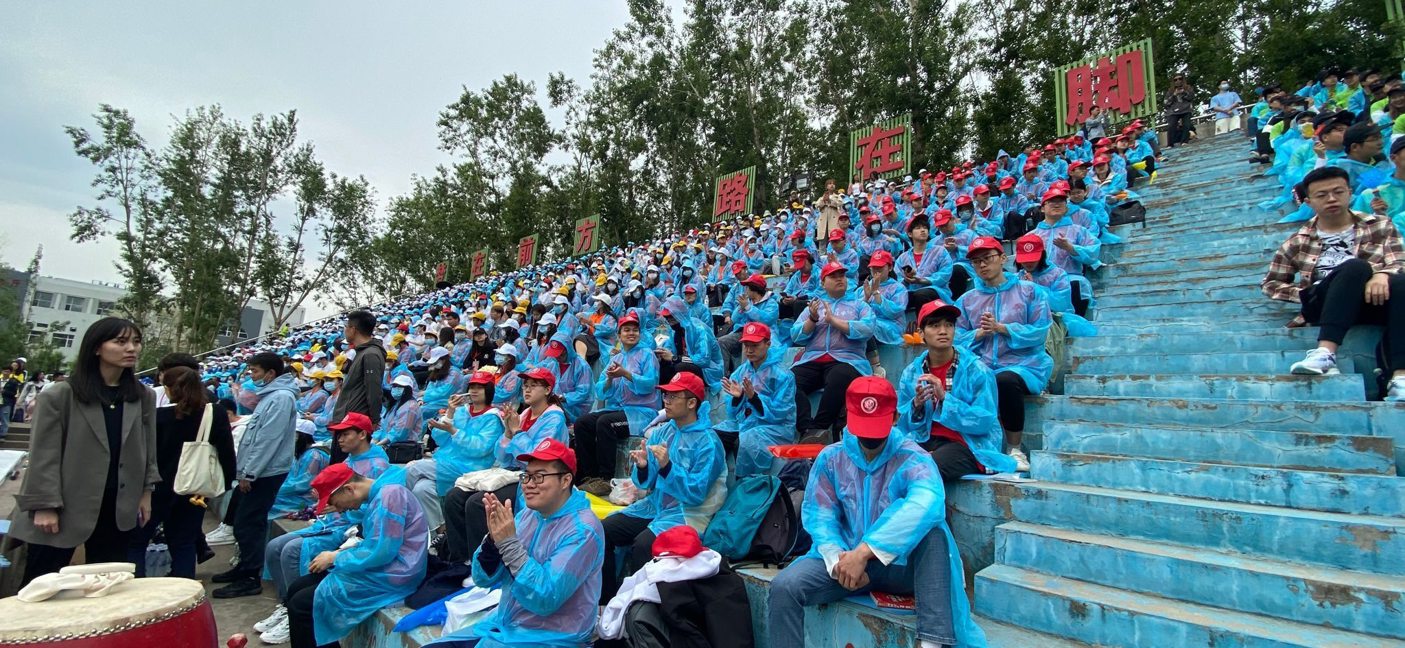 观众身着红衣,头戴红帽整齐入座。手持彩色应援棒,跟随组织人员气势磅礴的击鼓声,整齐的做着训练动作,为黑料正能量