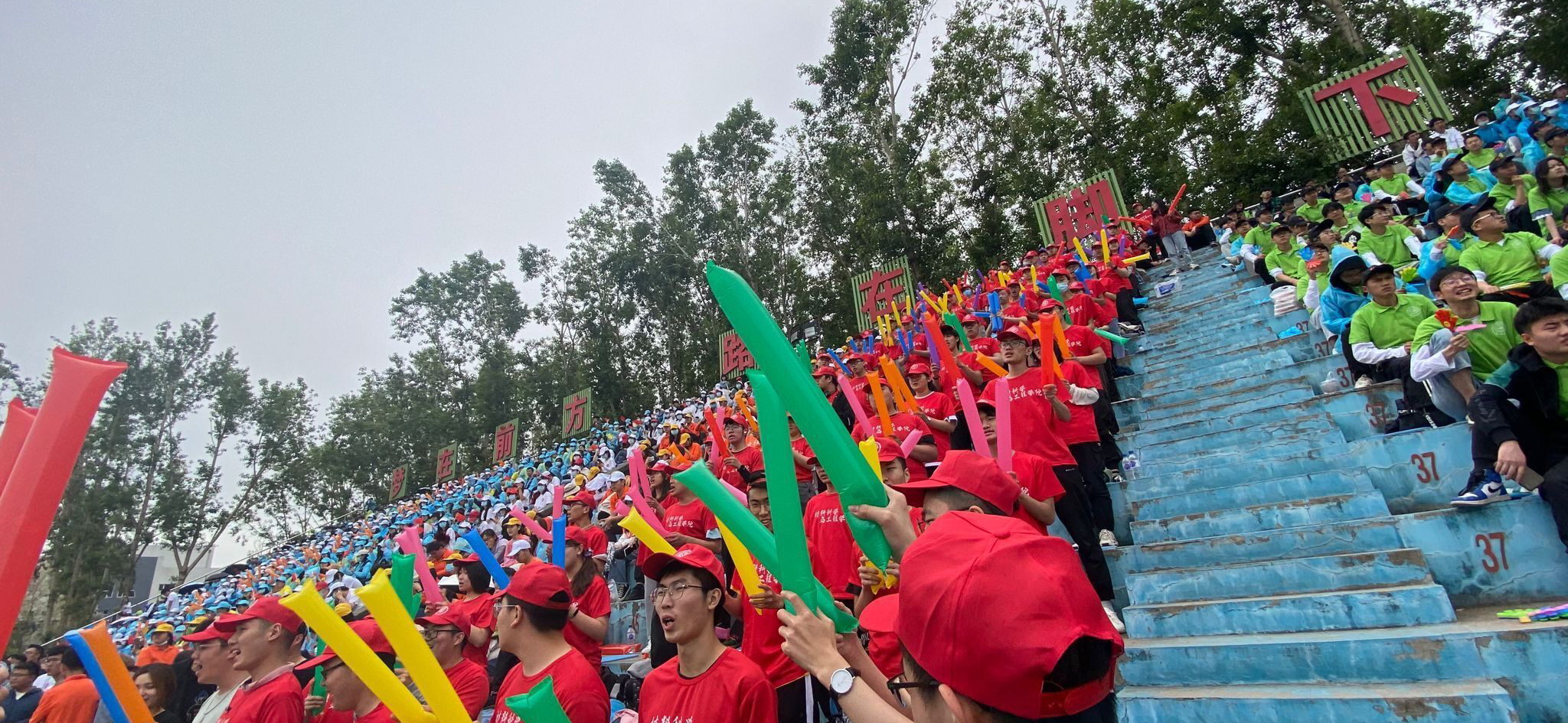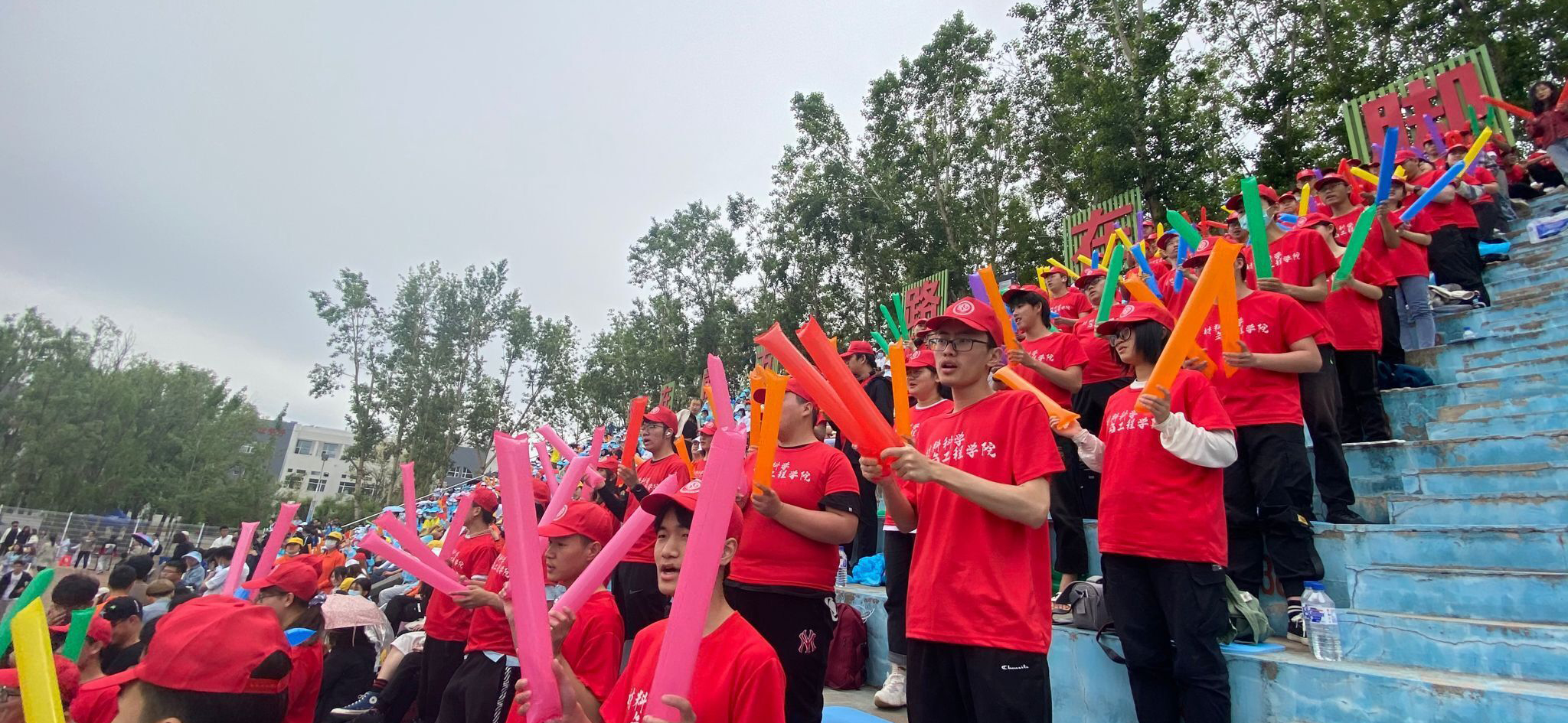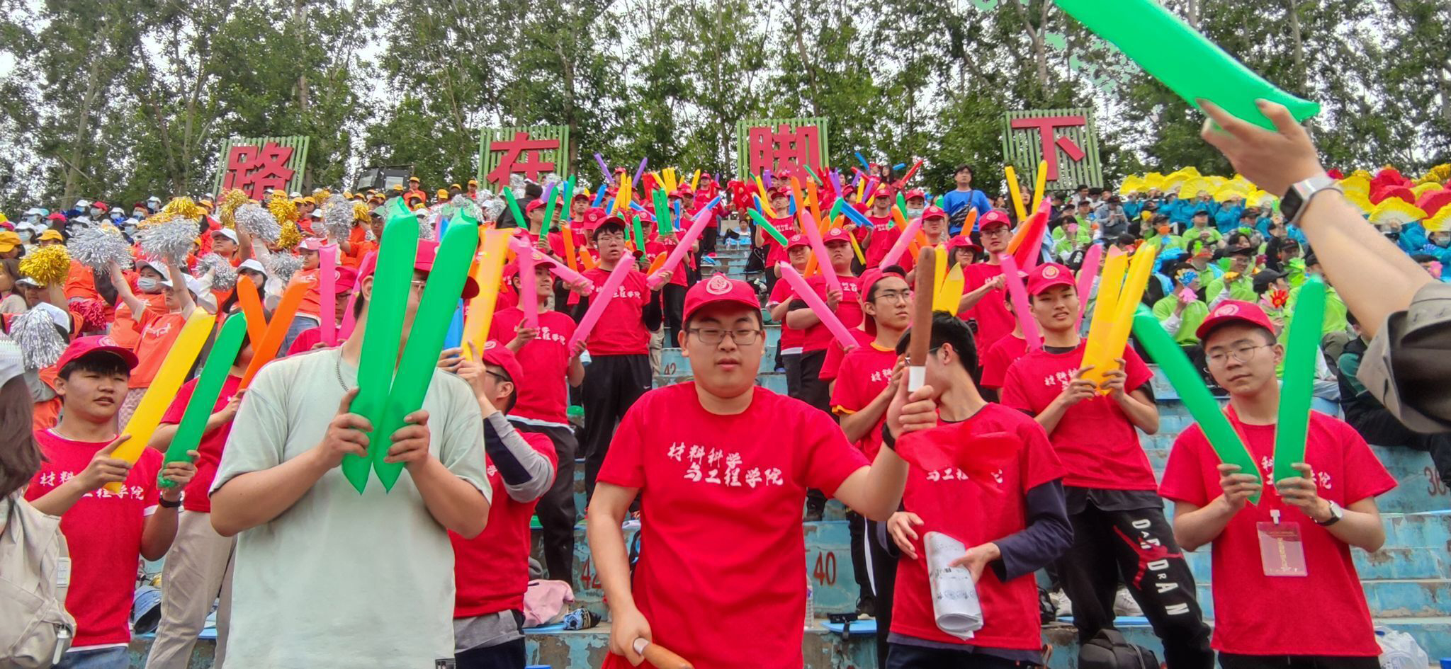 的运动员呐喊助威。“凌云赛场,斗志昂扬,唯我材料,创造辉煌。”短短16字,体现了材料学子的拼搏精神和信心,观众们挥舞充气棒大声喊出黑料正能量