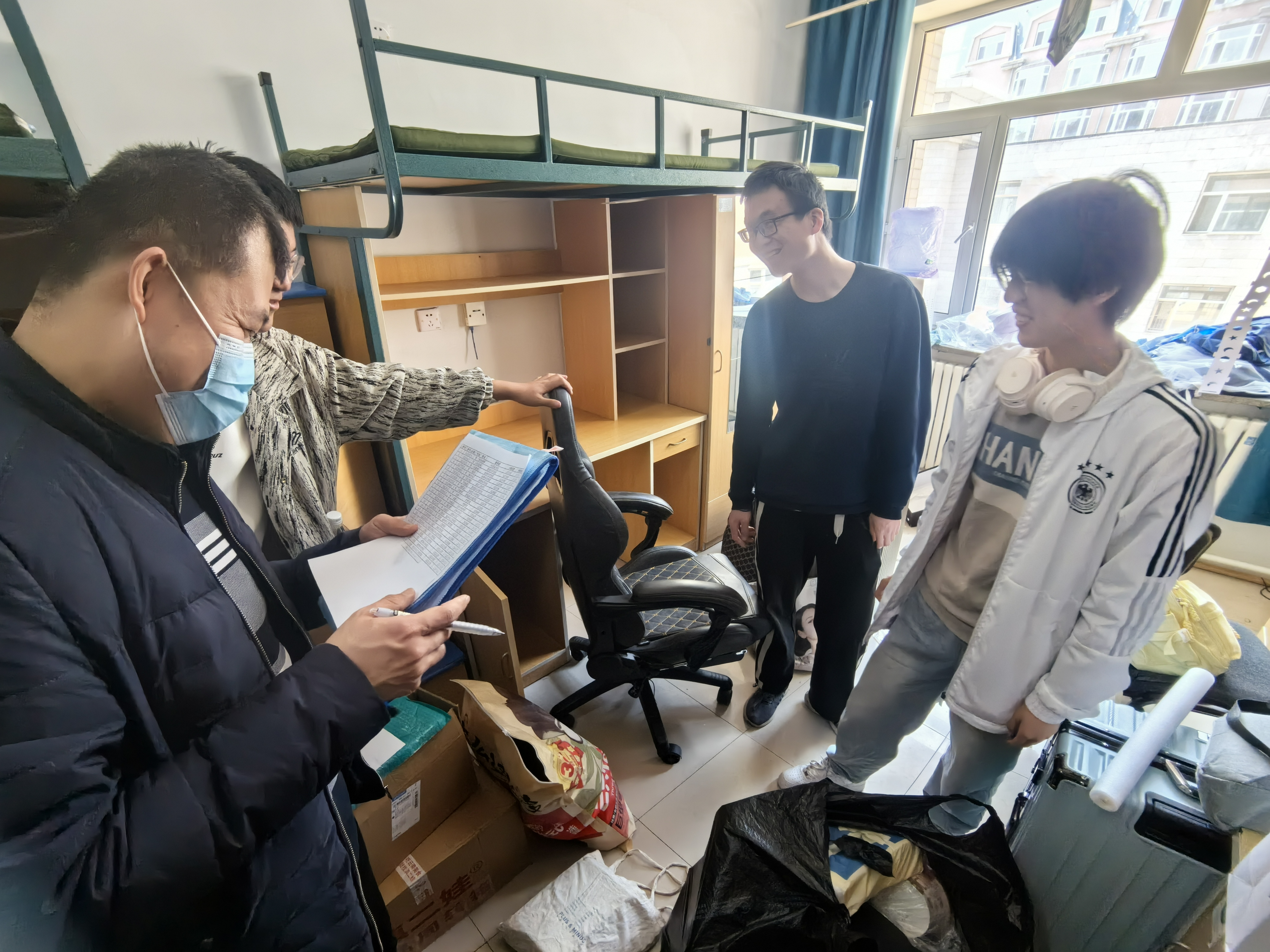严老师早早地来到了学生寝室,逐一走访有人员变动的寝室,落实床位变动,帮助同学们更快完成自己的搬迁任务。