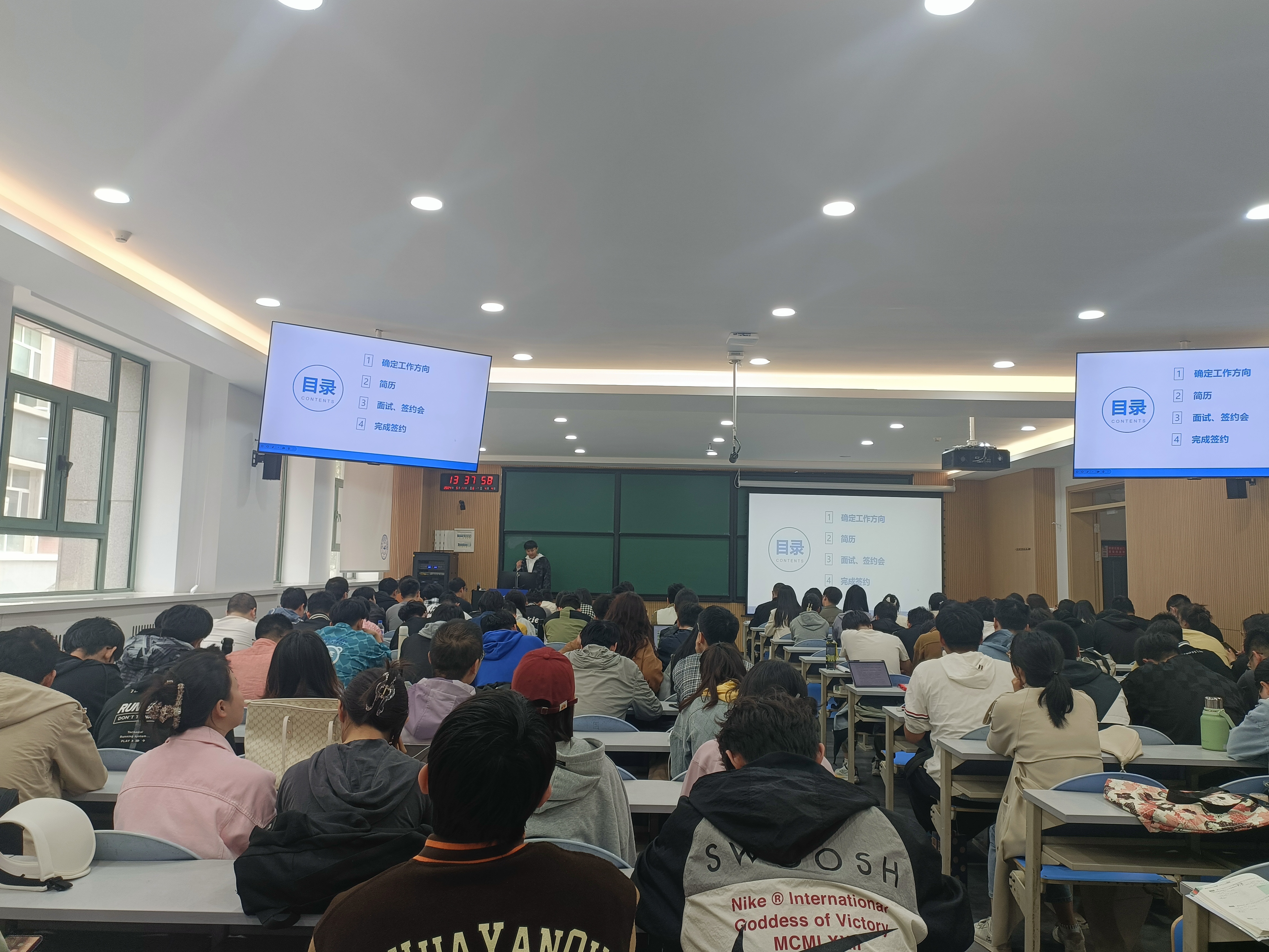 首先,由已经签约一汽集团的王圣智学长与应佳轩学姐分享自己在找工作过程中遇到的问题,以及应对各种问题的方法。随后,由考上公务员的艾森学姐介绍自己在找工作过程中的不断尝试过程,以及自己对于未来的明确分析。最后,严老师指出,不论选择考研或是工作,都要在充分分析了解自己目标的基础上去进行,并提醒同学们要提前规划自己的未来方向,做好准备。