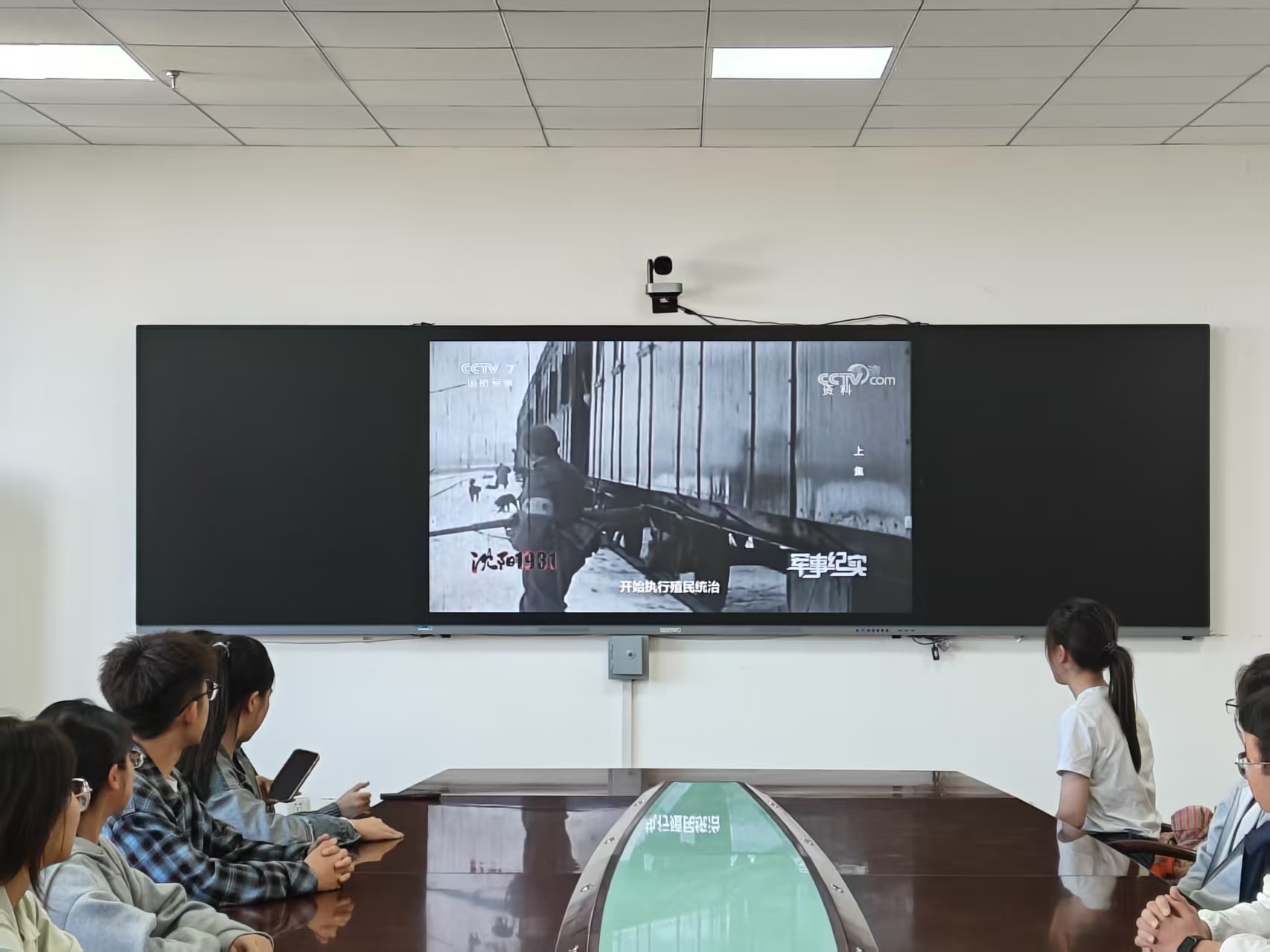 观看过程中,现场氛围庄重肃穆。随着纪录片开播,屏幕上泛黄的史料影像、真实的历史叙事,将大家带回1931年那个风雨如晦的日子。影片以大量未公开的珍贵史料为基础,通过历史影像修复技术、专家解读以及幸存者口述等多元形式,全景式还原了“九一八”事变的完整脉络。从日军深夜在柳条湖附近蓄意炸毁铁路、嫁祸中国军队的阴谋,到北大营内士兵在不抵抗命令下的无奈与悲愤;从沈阳城被日军侵占后商铺被抢、百姓流离失所的惨状,到东北各地抗日义勇军揭竿而起、在白山黑水间与敌人展开游击战的壮烈场景,每一个片段都直击人心。纪录片中那句“国既不国,家何能存”的呐喊,更是让在场所有学生深刻体会到国家主权与民族尊严的重要性。纪录片以客观详实的视角,展现了山河破碎的苦难历程与中华民族不屈的抗争精神,每一个片段都深深触动着学生们的心弦。