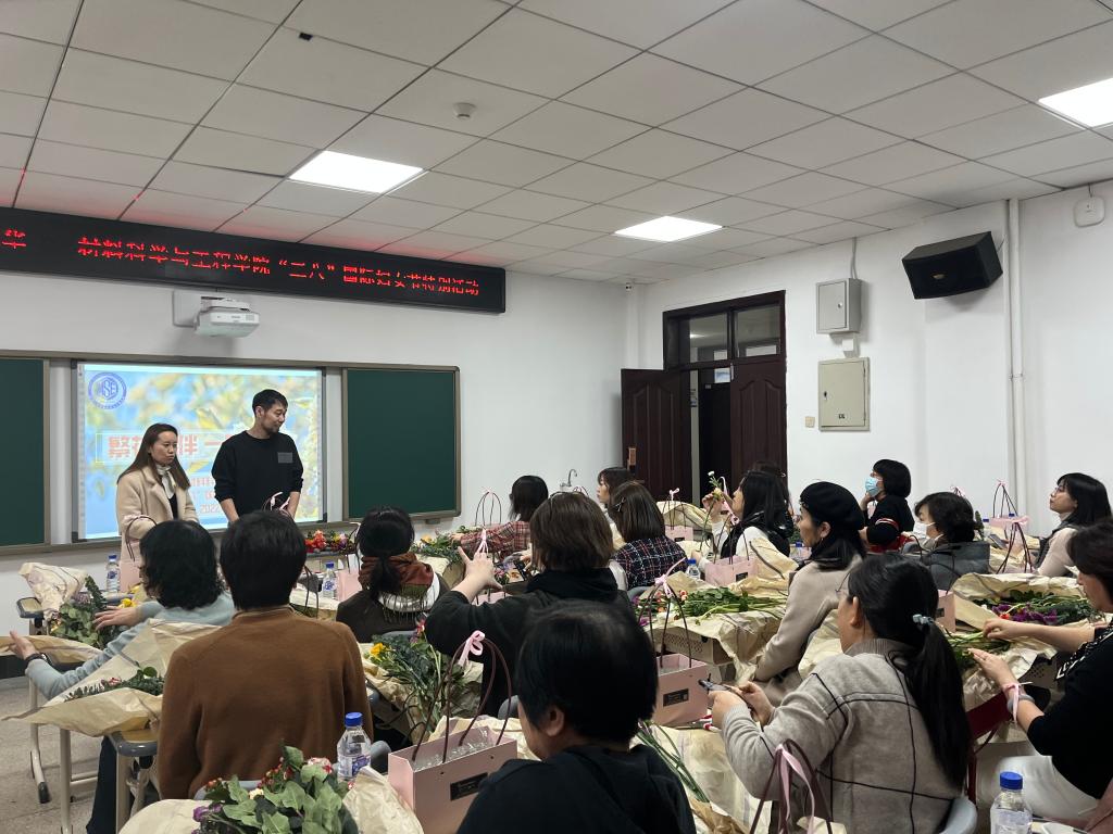活动伊始,郑孝义副院长对女教职工传达了节日的问候,对她们多年来在自己的工作岗位上锐意进取、奋进昂扬的精神风貌表示了高度赞赏,并祝愿她们在今后的生活中事业家庭双丰收。随着活动正式开始,花艺师首先讲解了多头玫瑰、洋牡丹、康乃馨等现场花卉的花形花语及养护技巧,而后老师们按捺不住跃跃欲试的心态,开始亲自动手以各式鲜花搭建装点手中的小花园,通过调整花形、修剪花枝、调整位置,老师们在花艺师的示范和指导下纷纷搭配出了自己独具匠心、各有特色的艺术小花篮,现场花团锦簇、生机盎然,老师之间氛围更是温馨热烈、朝气蓬勃。活动最后,刘远书记进行了总结发言,表示材料黑料正能量
