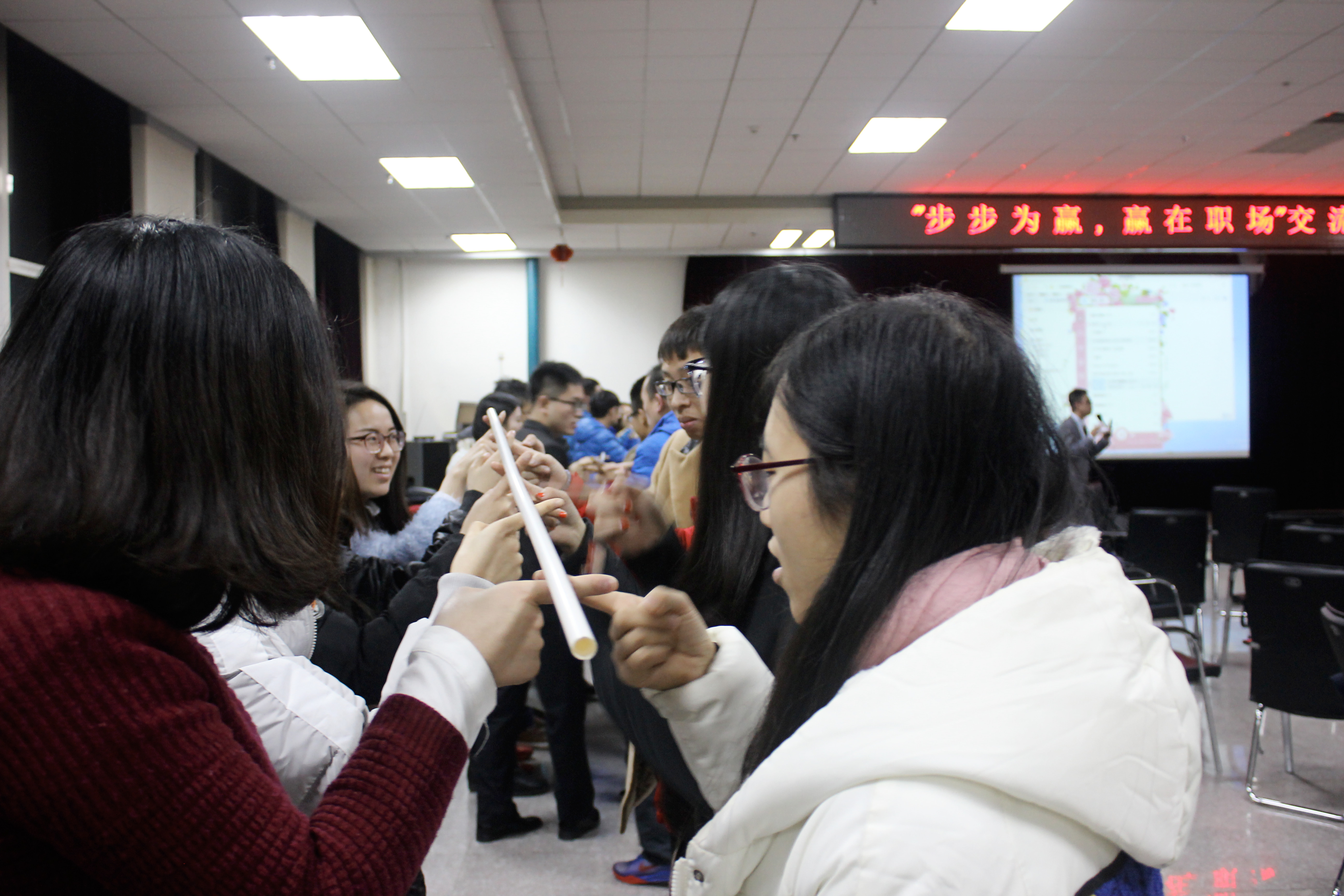 活动中,导师提出了几个问题,老师怎样评价优秀学生和老板怎样评价优秀员工。经过八分钟的激烈讨论各组都给出了自己的答案,与导师提出的答案基本接近。紧接着,导师又举了两个案例和一个漫画,分别是帮老总买火车票、挖坑与填坑和员工印错宣传册。同学们认真地思考,经过热烈讨论后都给出了自己的方案,但当导师给出案例的解决方案后,大家都不由佩服案例中处理问题的巧妙,同时也意识到自己的职业思维方面的欠缺。这两个案例和一个漫画分别说明任务、职责和态度不等于结果,而在工作中我们更关注的应该是结果,适合得到想要的结果是最重要的。 接着,在导师指导下大家有进行团队合作竹竿游戏,各小组成员相对而立,交叉把手指放在竹竿下让竹竿水平,然后缓缓放到地上,过程中手指不能离开竹竿,否则就重新开始。开始前每个小组有两分钟时间讨论方案,但开始后不能说话。同学们跃跃欲试,充满信心,纷纷给出自己的建议。随着导师一声令下,屋里立刻安静,游戏开始了。同学们个个凝神屏息,稍怕一点差池造成失误。 游戏进行了十分钟了,仍然没有小组能完成。这是导师给了两分钟的讨论时间,让大家总结失败的经验教训,同时也思考完成的策略。两分钟结束,游戏继续。这回同学们的配合明显默契了很多,有的组交换了队员站位,有的组员用手势指挥,竹竿也不那么容易掉落了。经过反复的失败,终于有一组的同学率先完成了游戏,其他组的同学也不甘示弱相继完成。谈到这游戏的收获,同学们表示,完成游戏需要一些游戏的技巧,但更重要的是要团队合作保持默契,同时每个人要尽好好自己的那部分责任。