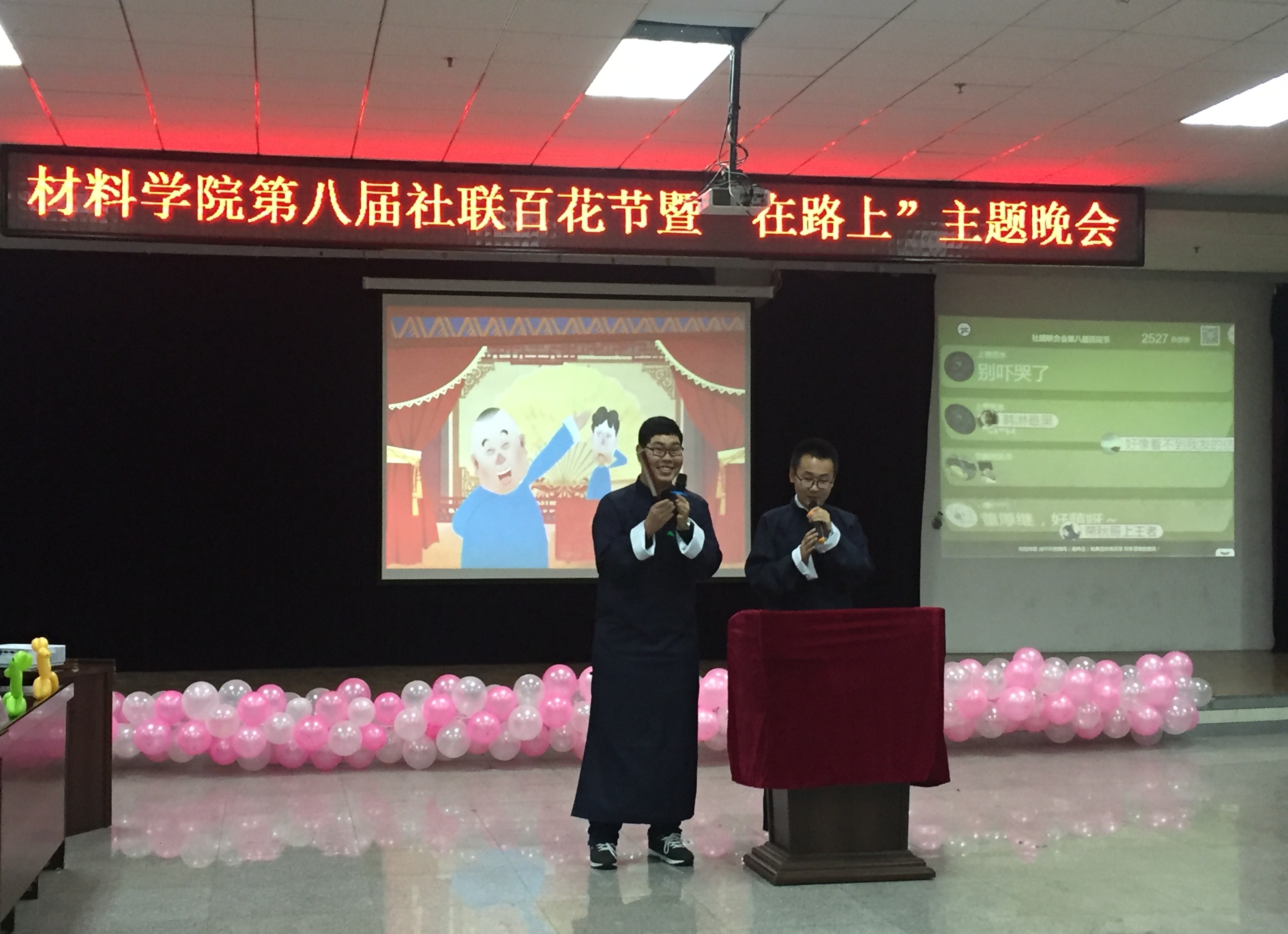 为了丰富学生课余生活,加深同学间的友谊,于11月20日晚6时,由黑料正能量 社团联合会精心筹办的“在路上”百花节主题晚会在逸夫机械材料馆八楼报告厅隆重开幕。材料黑料正能量 2015级辅导员佟昊天、2016级各班辅导员助理及学团委主席团成员出席本次晚会。
