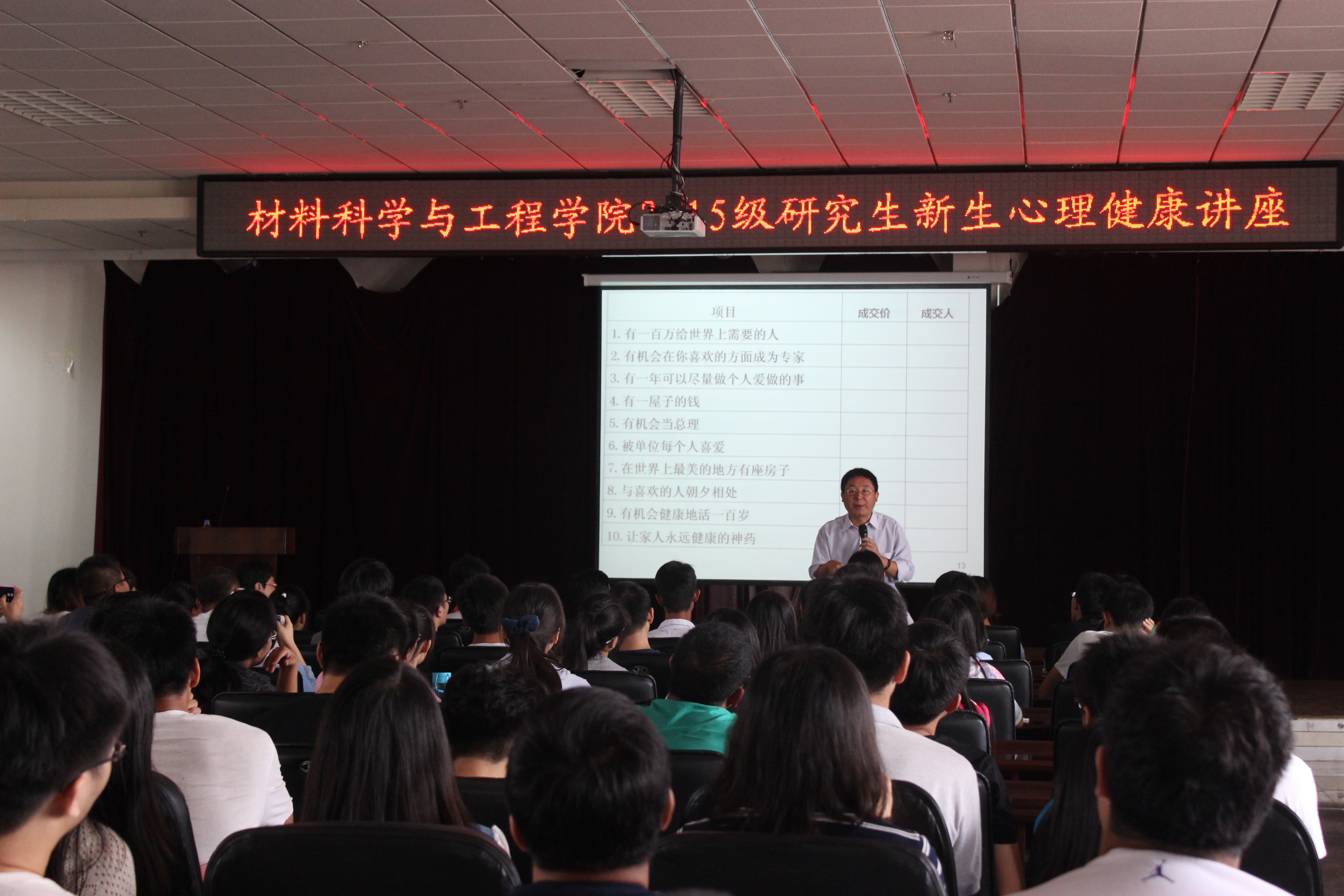 2015级研究生新生进行心理健康教育专题讲座。胡老师以其丰富的专业知识和幽默风趣的演讲风格为2015级新生带来了一场精彩的心理健康讲座。整个过程中胡老师以观看视频,做小游戏,“价值拍卖”等形式让大家积极参与,同学们投入性高,氛围活跃。同时胡老师围绕现阶段研究生面临的困惑和压力进行分析,并辅以积极有效的解决手段,勉励大家多转变视角,以积极平和的心态来面对压力和挫折,教导大家做一个乐观、豁达的人。最后胡老师介绍了黑料正能量