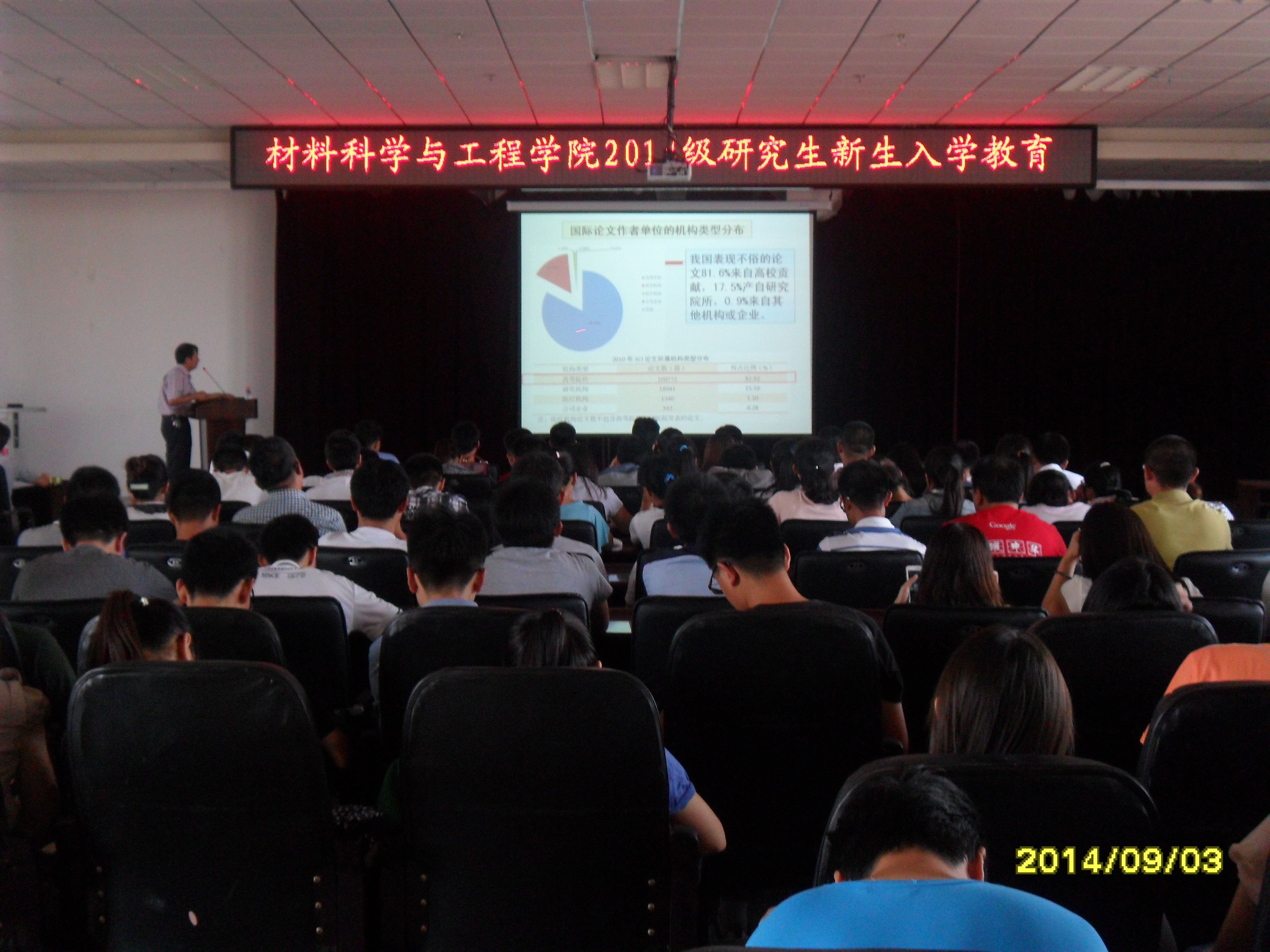 在逸夫机械材料馆报告厅举行了2014级研究生入学教育大会。副院长朱永福教授、党委副书记于雅琳老师、研究生办公室秘书刘徽老师,以及材料黑料正能量