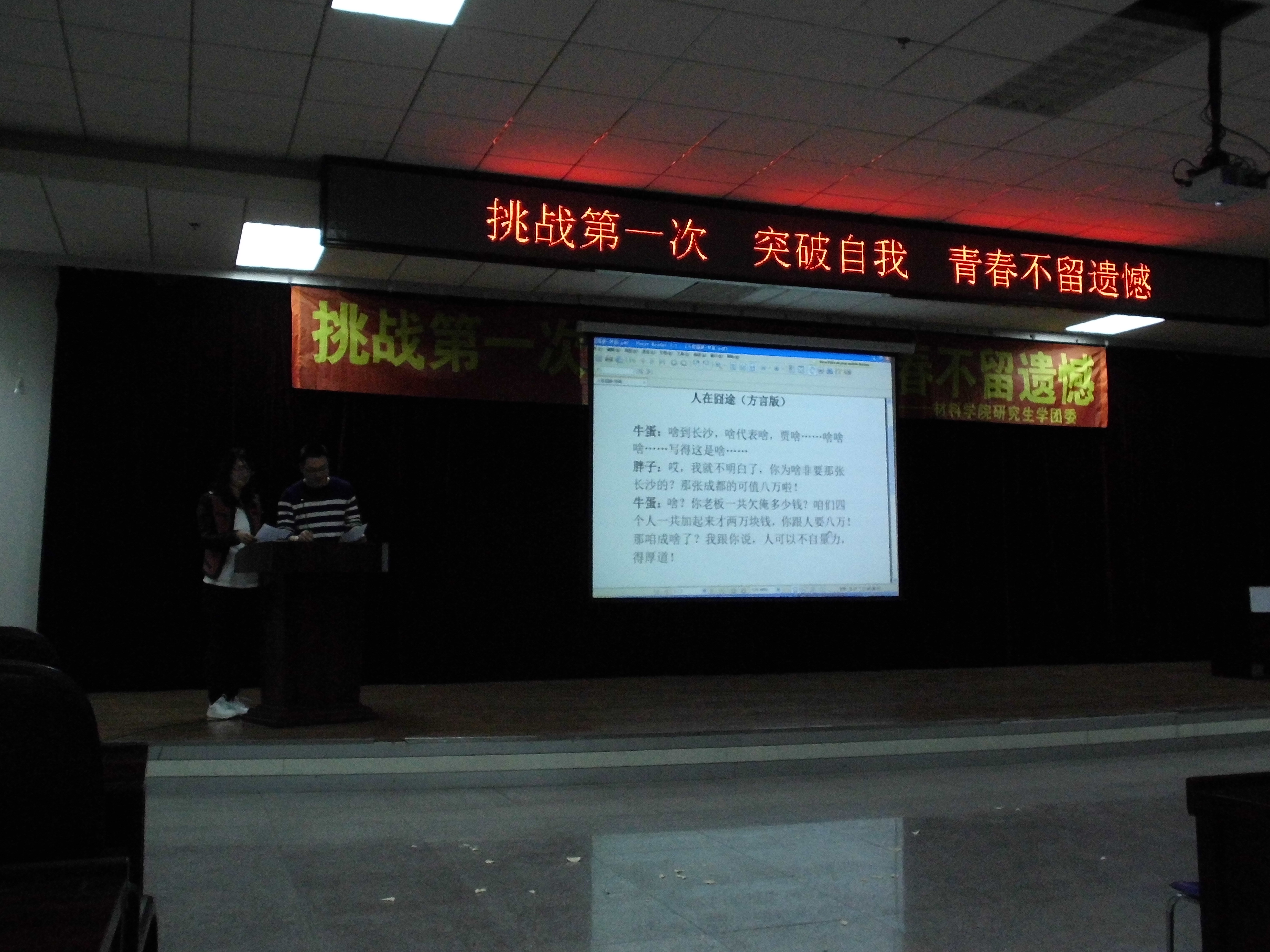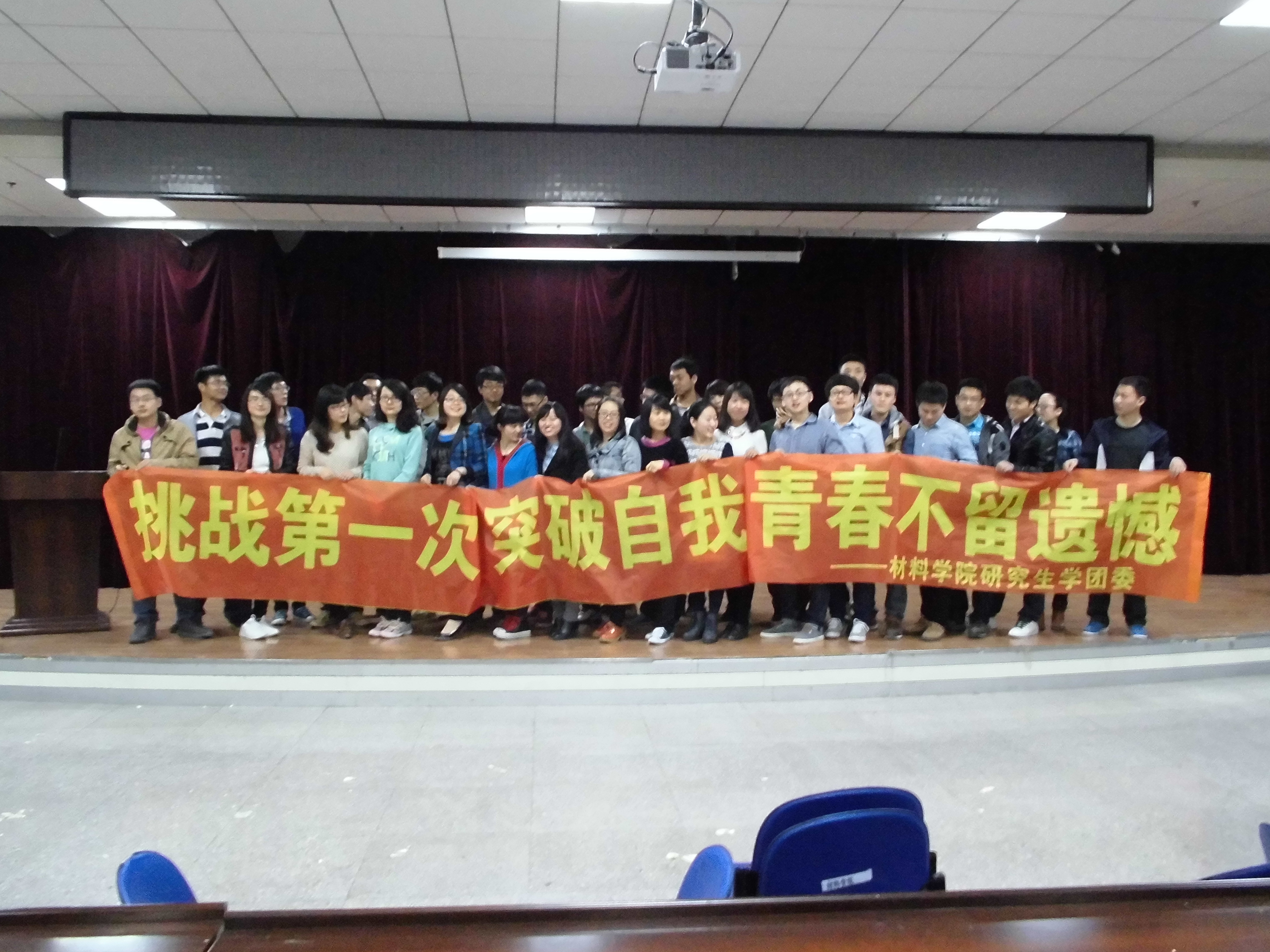 研究生部团委于2014年4月13日晚在逸夫机械材料馆八楼会议室举办了一场名为“挑战第一次,突破自我,青春不留遗憾”的主题晚会。契合本次晚会主题,此次活动意在鼓励同学们分享自己最难忘宝贵的人生第一次经历,同时为同学们搭建平台,给予他们挑战人生第一次,突破自我的机会。