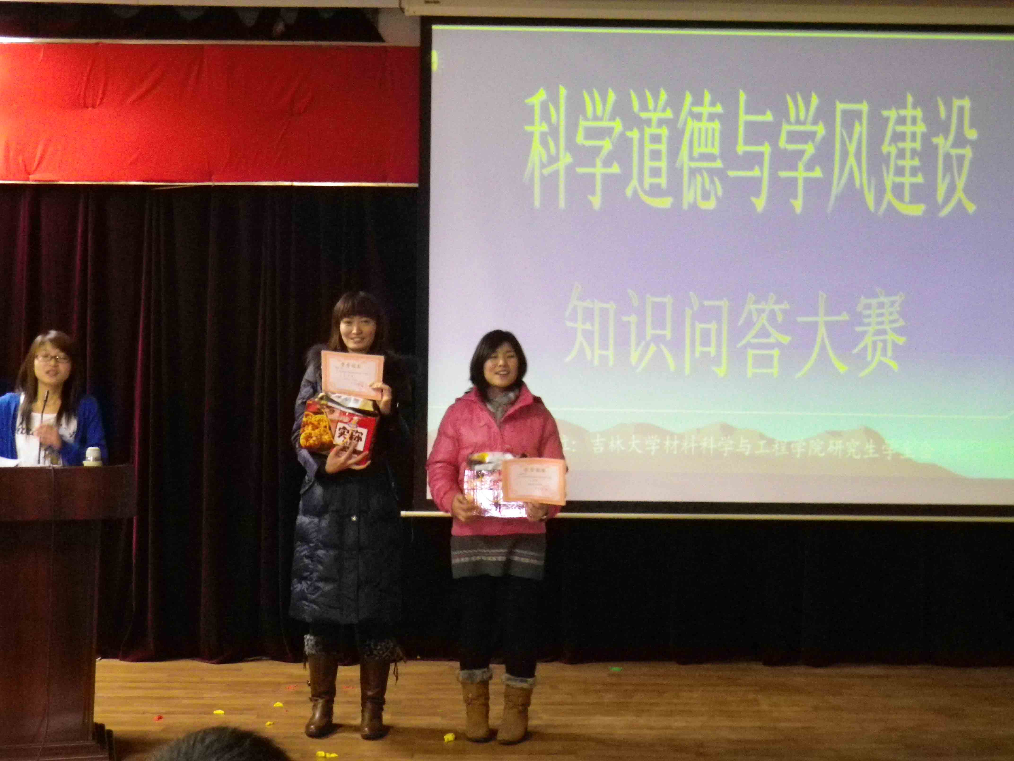 继开展“恪守学术道德,加强学风建设”主题系列活动之签名活动、专题讲座和有奖征文活动后,又举办了本次知识问答大赛。参赛队员按专业分为五组,分别为高分子和无机非材料组、金属材料组、焊接工程组、铸造工程组和锻压工程组,每组三位代表参赛。问答大赛分必答题、抢答题和观众互动三个环节,各环节穿插进行,参赛选手热情高涨,精彩角逐。观众互动环节,以“击鼓传气球”的方式选择答题者,充分调动了观众的积极性,令现场气氛热烈。活动历时一个多小时后,在轻松愉悦的氛围中落下帷幕。最终金属材料组以总成绩100分摘取本次知识问答大赛的桂冠。