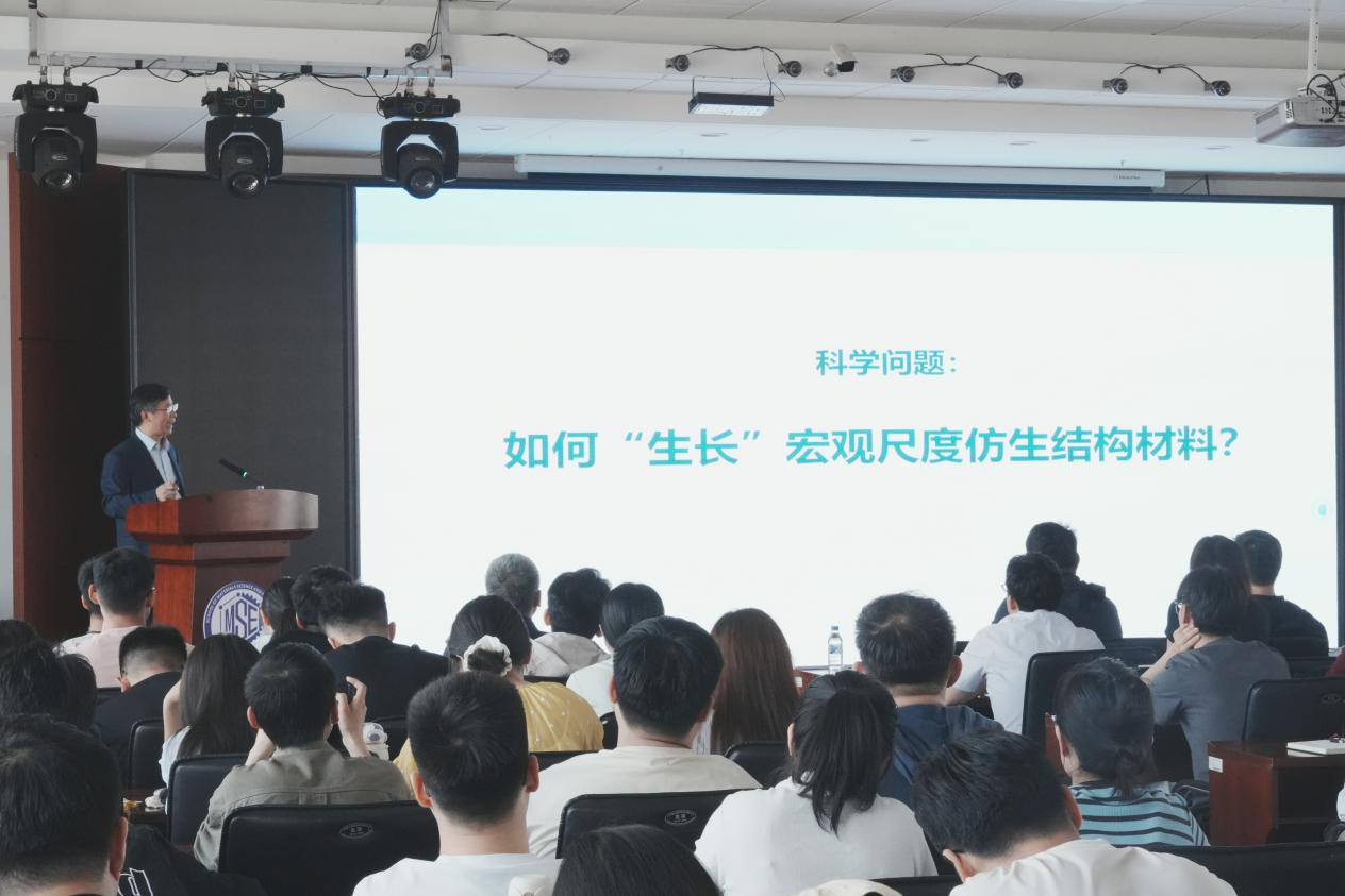 俞书宏院士系统总结了其团队多年来在运用仿生理念设计制备一系列仿生结构材料和宏观尺度组装体材料方面取得的研究进展。他通过生动的案例和详实的数据,深入浅出地阐述了如何开展多学科交叉的前沿探索研究,涵盖了化学、材料学、生物学、物理学等多个学科领域的融合。俞书宏院士指出,仿生材料的发展不仅为解决传统材料面临的问题提供了新思路,还为开发具有特殊性能和功能的新型材料开辟了新途径。俞书宏院士特别强调了交叉科学人才培养的重要性,鼓励年轻的科学工作者打破学科壁垒,积极探索不同领域之间的联系和创新点。报告内容丰富、视野开阔,既包含了前沿的学术研究成果,又为师生们指明了未来研究的方向,令在场师生受益匪浅。
