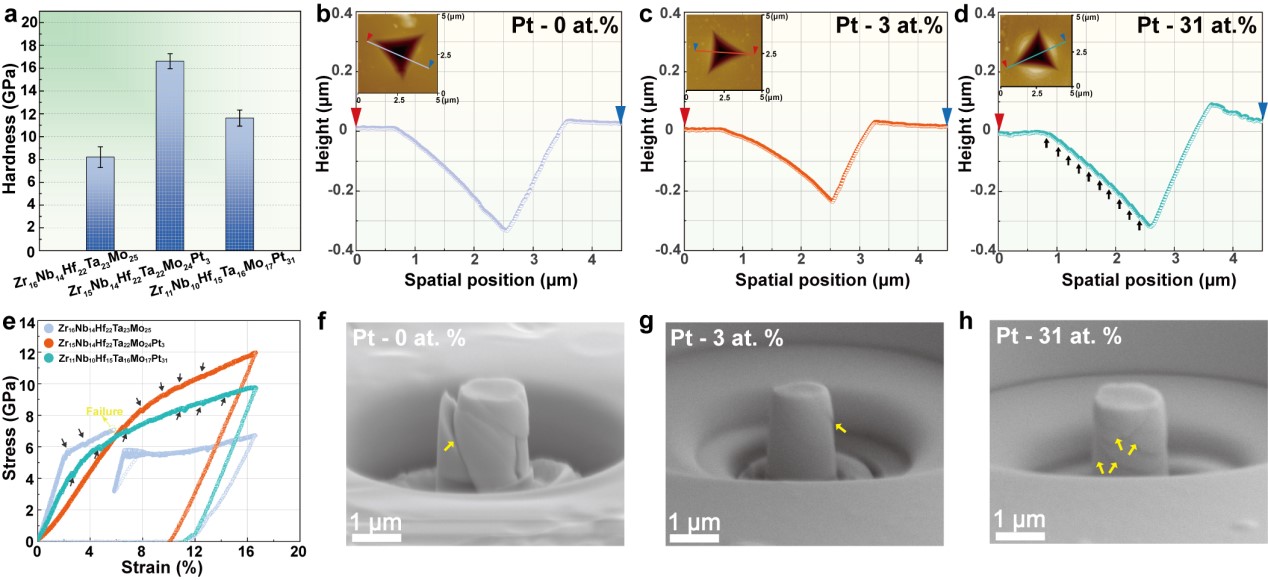 图3. Zr-Nb-Hf-Ta-Mo HEA与其他含Pt的HEA的力学性能比较。a, 三种HEA(Pt-0 at.%、Pt-3 at.%、Pt-31 at.%)的硬度结果。具有次晶结构的Pt-3 at.% HEA显示出优异的硬度。误差条表示标准偏差。b-d,压痕的横截面轮廓,沿着相应插图的彩色线(红色和蓝色三角形分别表示轮廓的开始和结束)。在Pt-31 at.%多层非晶HEA中出现了与剪切带相对应的大量偏移(由箭头标记)和压痕周围的大堆积高度,这些偏移在Pt-3 at.%次晶HEA上是不可见的。e, 三种HEA(Pt-0 at.%、Pt-3 at.%、Pt-31 at.%)的压缩工程应力-应变曲线。曲线中的弹出事件用黑色箭头标记。f-h,分别为变形的Pt-0 at.%、Pt-3 at.%和Pt-31 at.% 微柱的SEM图像。变形微柱上的表面偏移由黄色箭头标记。