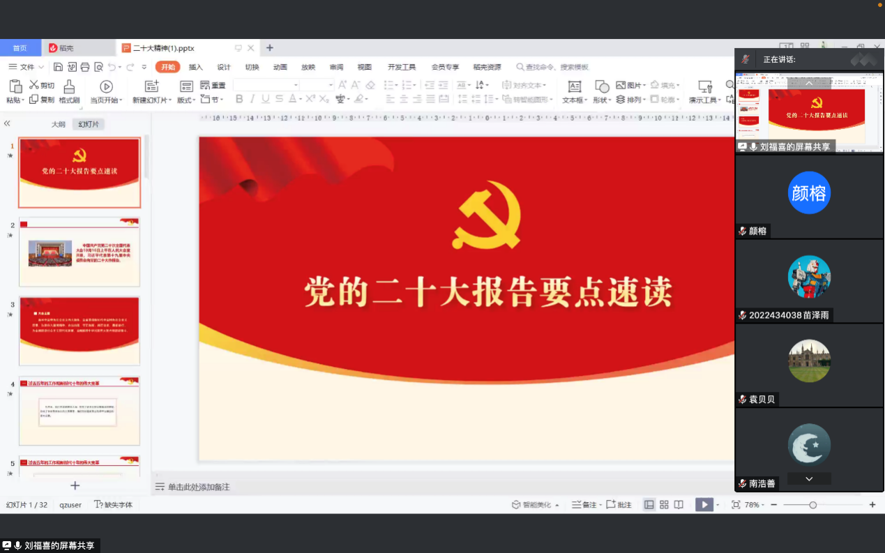 学生党支部在腾讯会议上召开“学习二十大,勇担民族复兴之使命”主题专题党课,学生党支部书记黄宏主持此次活动。支部书记黄宏主持会议并发言,支部委员王明明作主题汇报。支部39名党员全部参加。