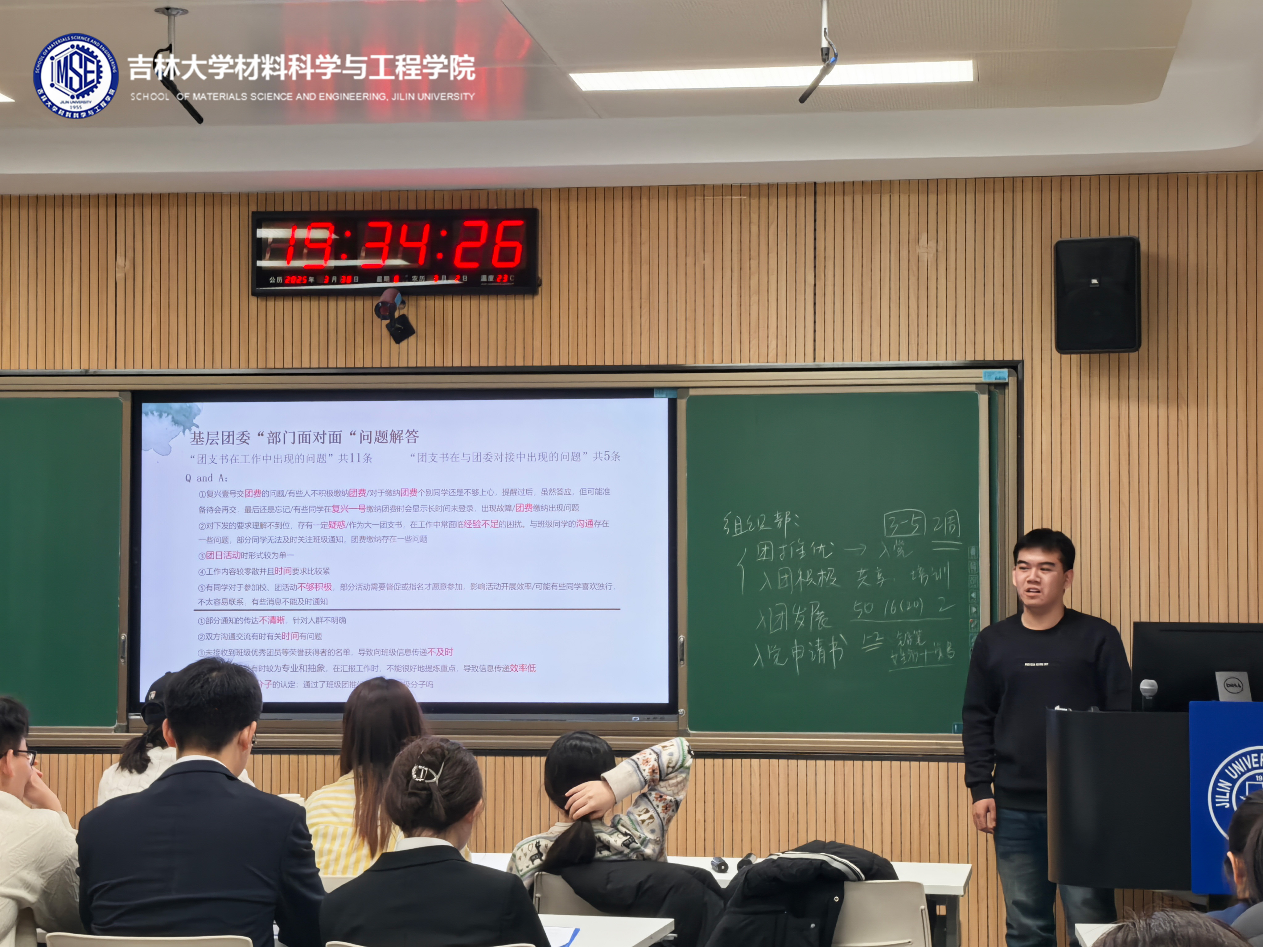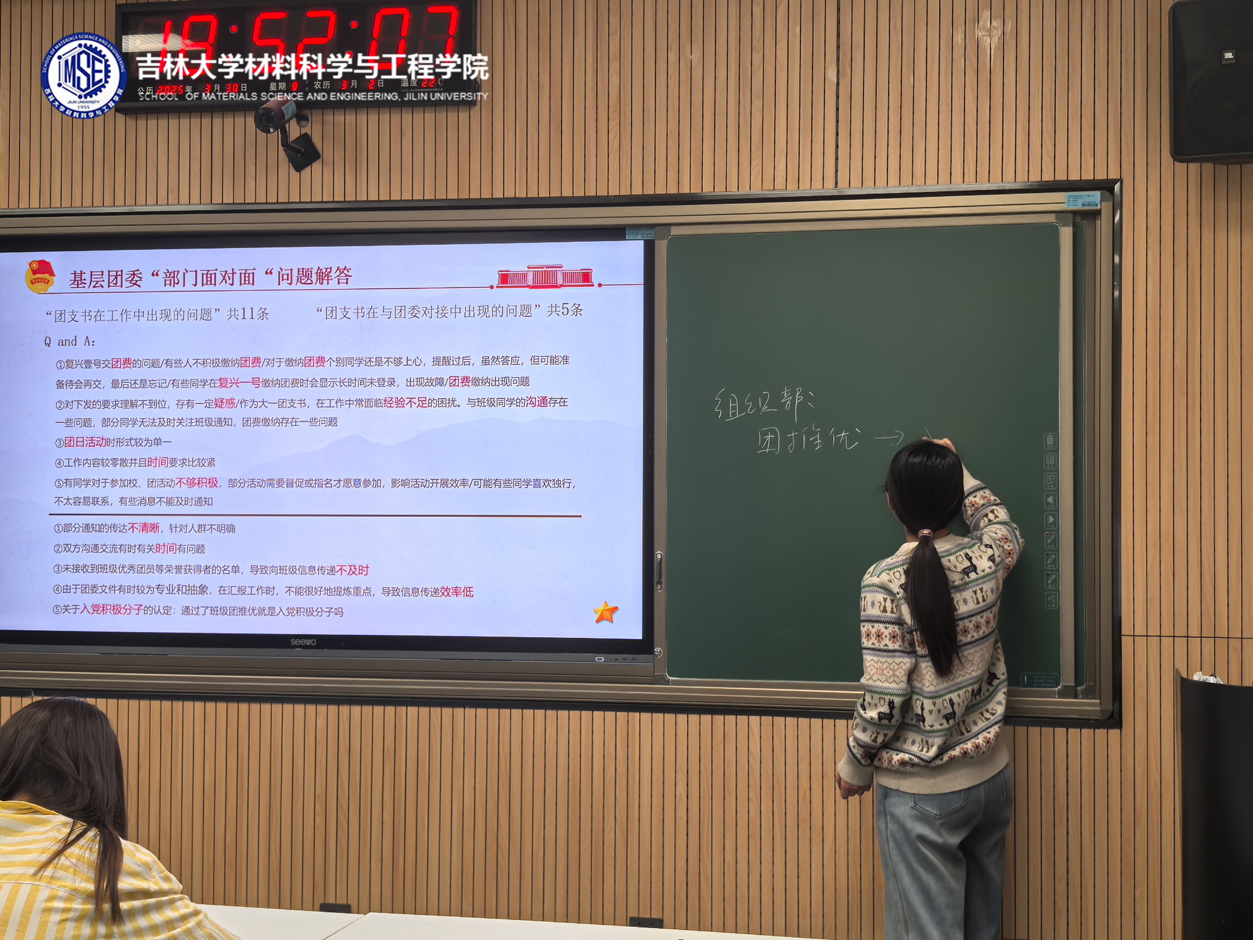 随后针对前期调研收集的16项工作问题,团委各部门负责人现场答疑。组织部负责人李诗语针对工作零散且时效性强、同学参与活动不积极、通知传达不畅等问题进行了解答,并梳理了组织部主要工作安排集中时间及工作流程;秘书部负责人周小涵就复兴壹号团费缴纳困难信息传达效率低等问题提出解决方案,呼吁团支书加强沟通、及时反馈;社团管理部负责人胡怀碧重点介绍了本学期计划开展的文体活动,呼吁大家引导班级同学踊跃参加,做好宣传工作;青年发展部负责人王颢添针对团日活动时形式较为单一的问题,强调活动应贴近学生生活,将日常实践与思想教育相结合;团委学生副书记魏轩宇对团支书过往工作给予肯定,呼吁大家广泛了解班级同学的真实想法,积极向团委提出吸引青年、切实可行的活动想法,并针对部分同学对于入党流程的疑惑做出解答。