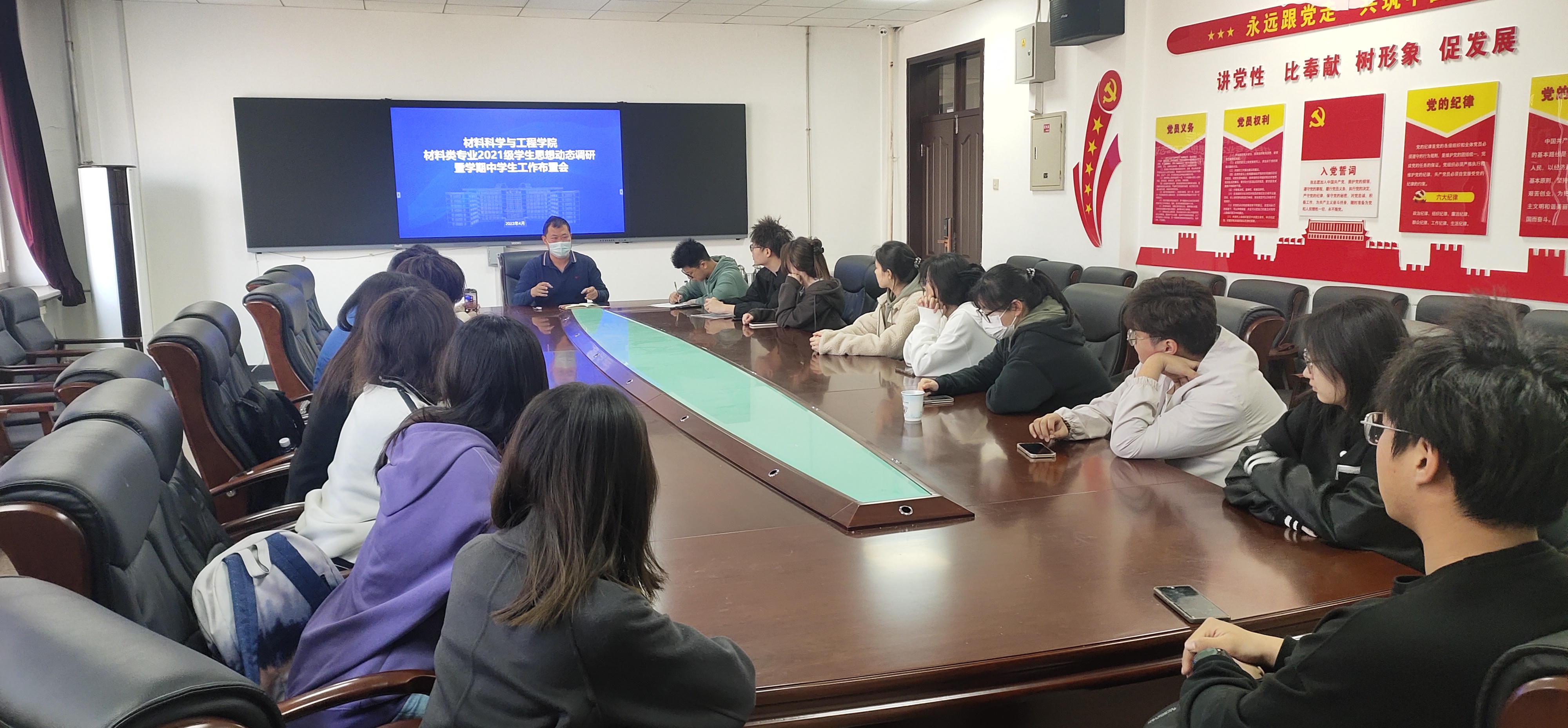 材料类2021级本科生辅导员严冬老师,于2023年4月17日中午在南岭校区逸夫机械材料馆410会议室组织召开期中阶段学生思想动态调研暨期中阶段学生工作布置会,材料类2021级各班班长、团支书参加了本次会议。