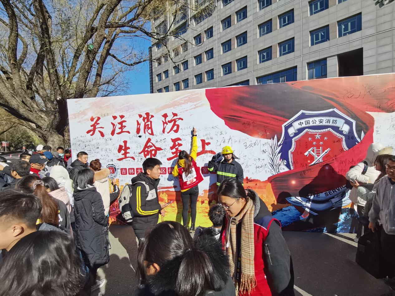 的同学组织的志愿者队伍向同学们发放传单,引导学习消防和国家安全等知识,参观消防服装以及各种常见违章电器,广场各个展板前人群络绎不绝,活动达到高潮。大约一个小时后,随着展板上签满师生姓名本次消防疏散演练及安全宣传活动圆满结束。