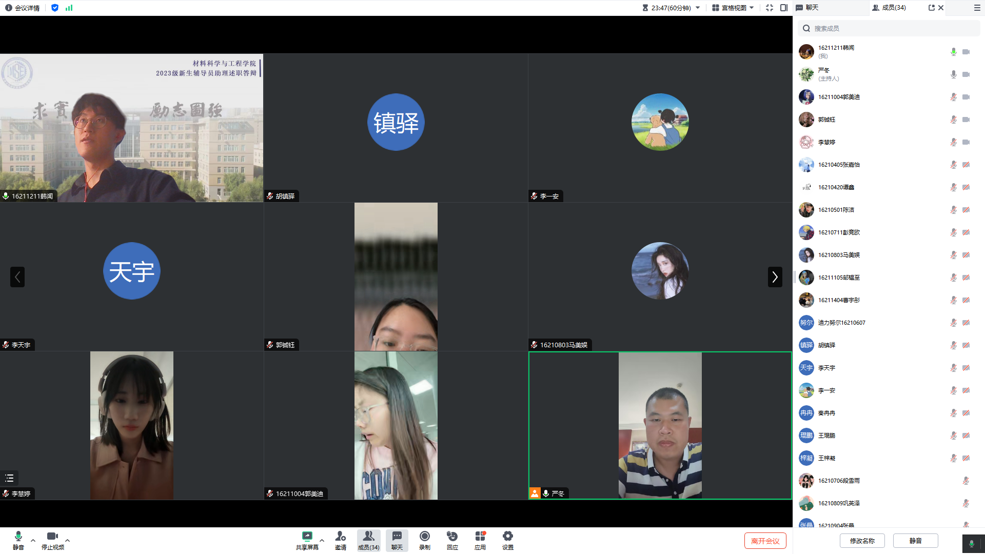 于2024年5月13日晚八点在腾讯会议线上召开21级教学班与行政班主要学生负责人会议,会议由严冬老师主持,各班级主要学生负责人参与此次会议。