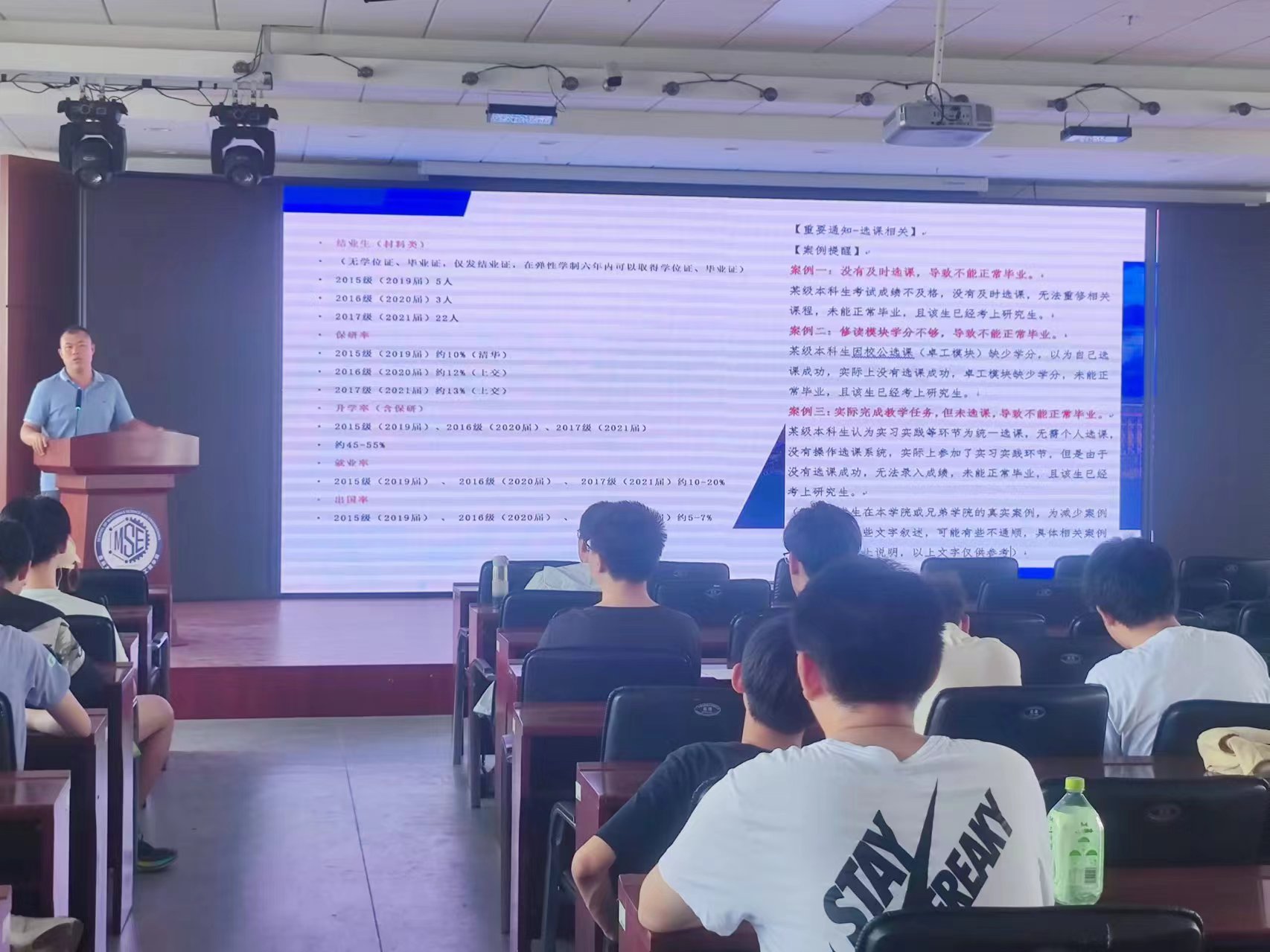 于2024年6月19日,在逸夫机械材料馆八楼报告厅召开年级大会,2021级辅导员严冬老师针对2021级学生开展了一次重要的学业提醒及集体谈话。