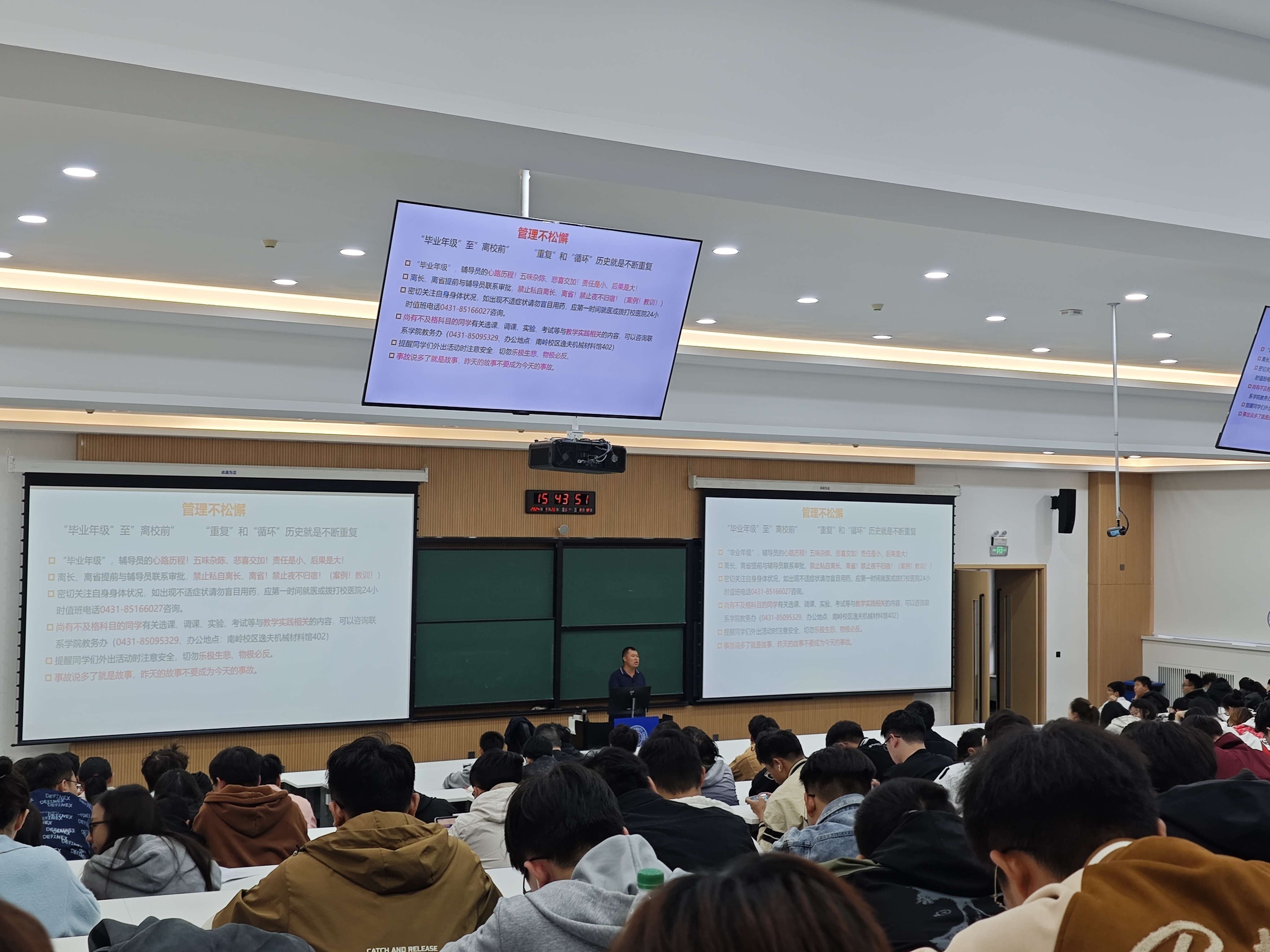 随后,严冬老师对本学期毕业年级的主要工作进行介绍,提醒大家不要错过网上报考以及招聘工作等相关时间节点,并提醒学生要注意日常安全,保持寝室卫生。