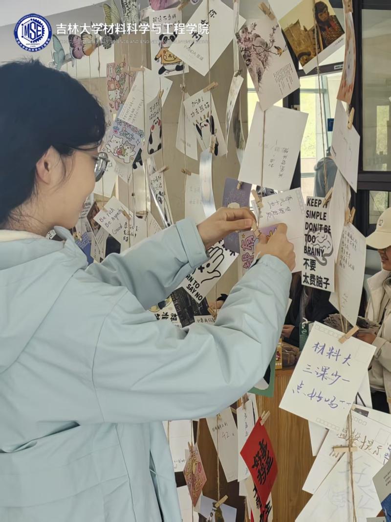 同学们在逸夫楼二楼中厅在卡片上写下自己对陌生人的祝福或者鼓励,将卡挂在“祝福墙”上,然后从上面获得一张来自他人的祝福卡片,并领取一份甜蜜礼物。