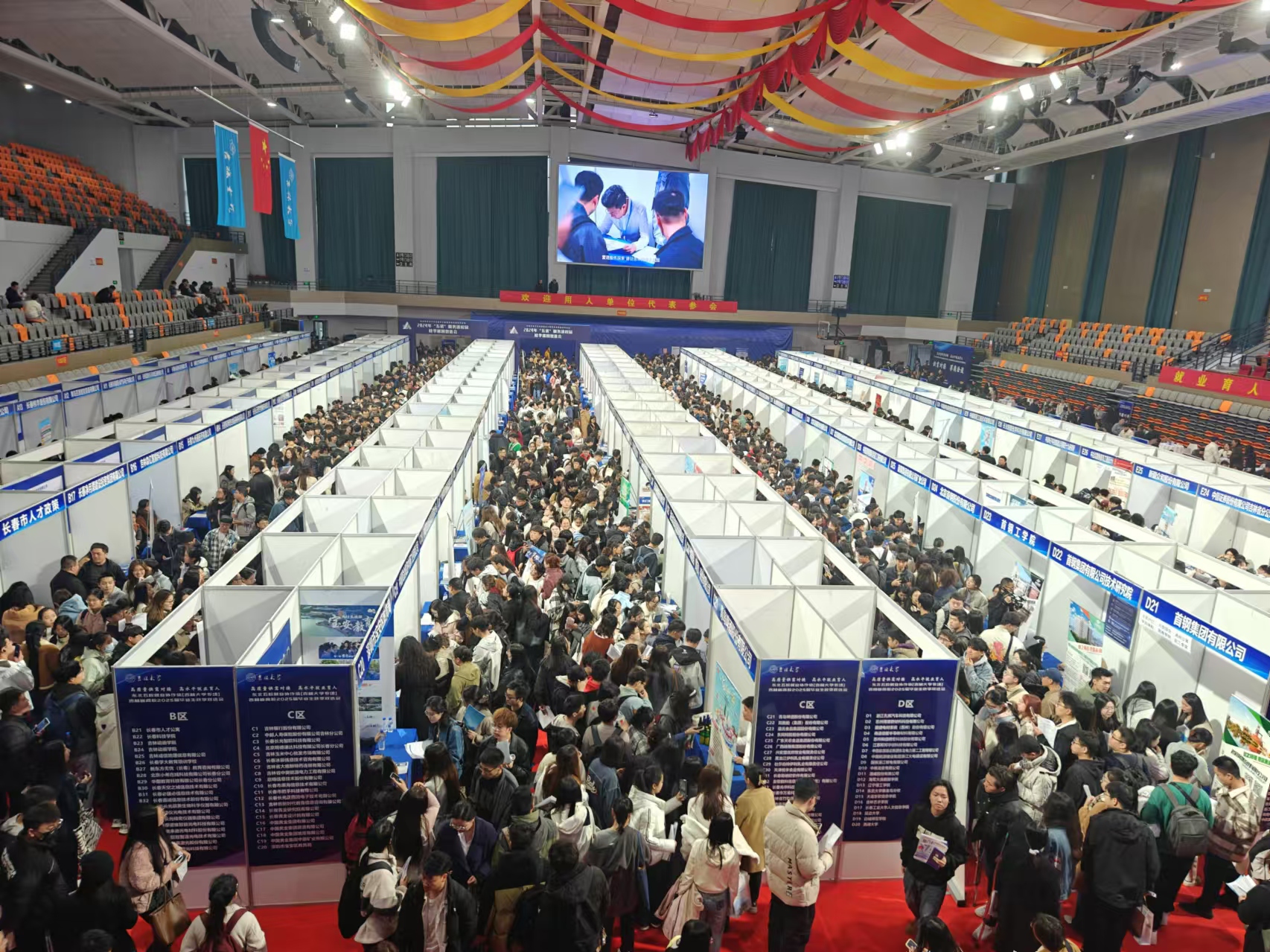 中心校区宋治平体育馆举办,到达双选会现场后,同学们求职热情高涨,与招聘单位深入沟通交流,收益良多。同学们积极了解意向单位的岗位工作内容、待遇福利、知识储备需求等信息。招聘单位也热情地与同学们进行互动,确保每位同学都能充分理解职位的具体要求和工作内容。其中,有一些备受欢迎的公司吸引了大量的同学前来排队。